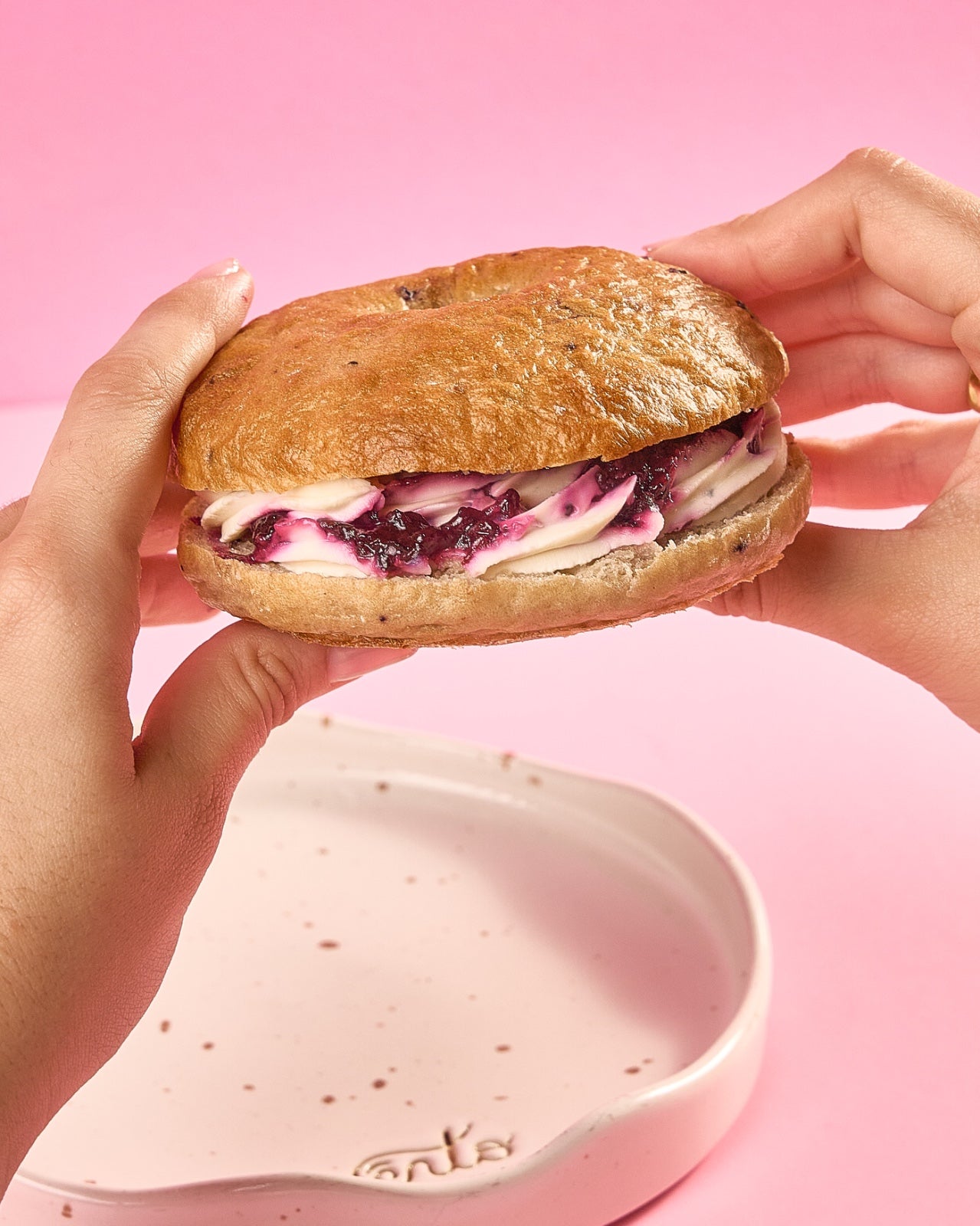 Un bagel suavecito con crema y compota de arándanos. Pura dulzura en forma redonda.