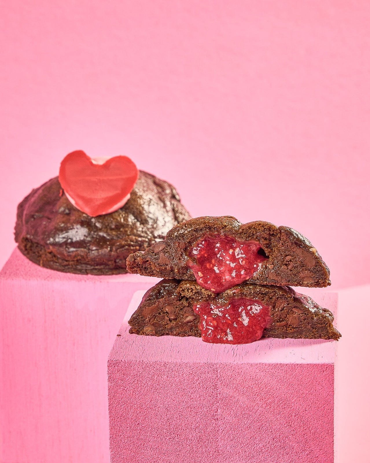 Galleta intensa de chocolate con un corazón de frambuesa al centro.