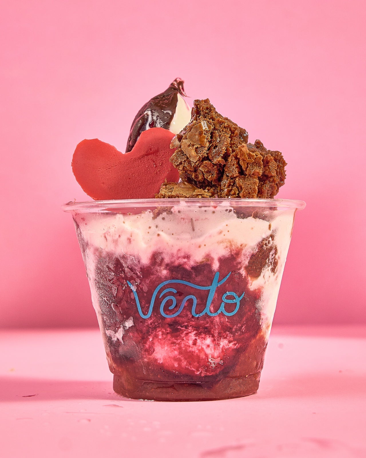 Helado de frutos rojos con toppings chocolatosos y un corazón encima, porque sí.