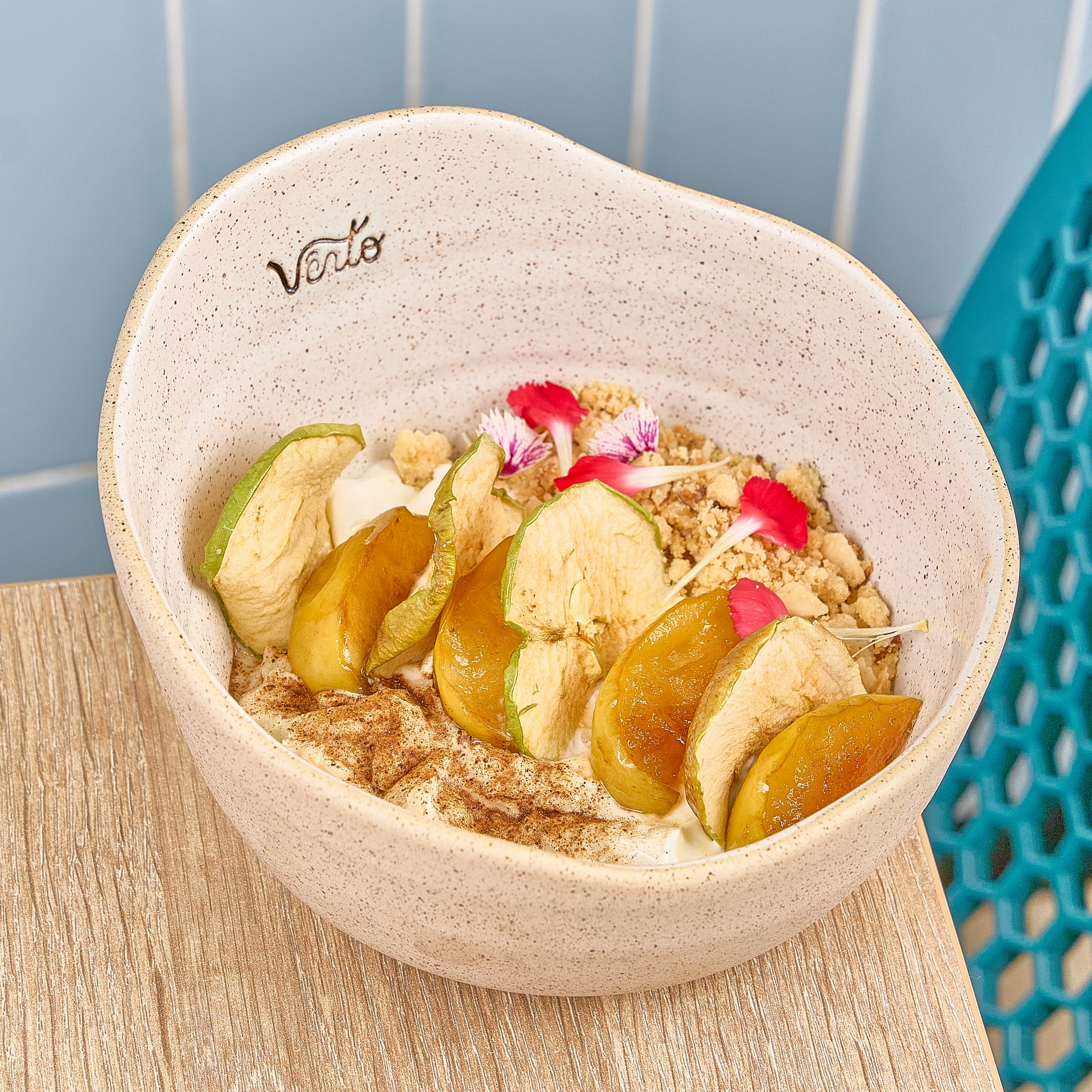 Avena trasnochada con manzana verde, yogurt griego, crumble de nueces & sirope de miel.