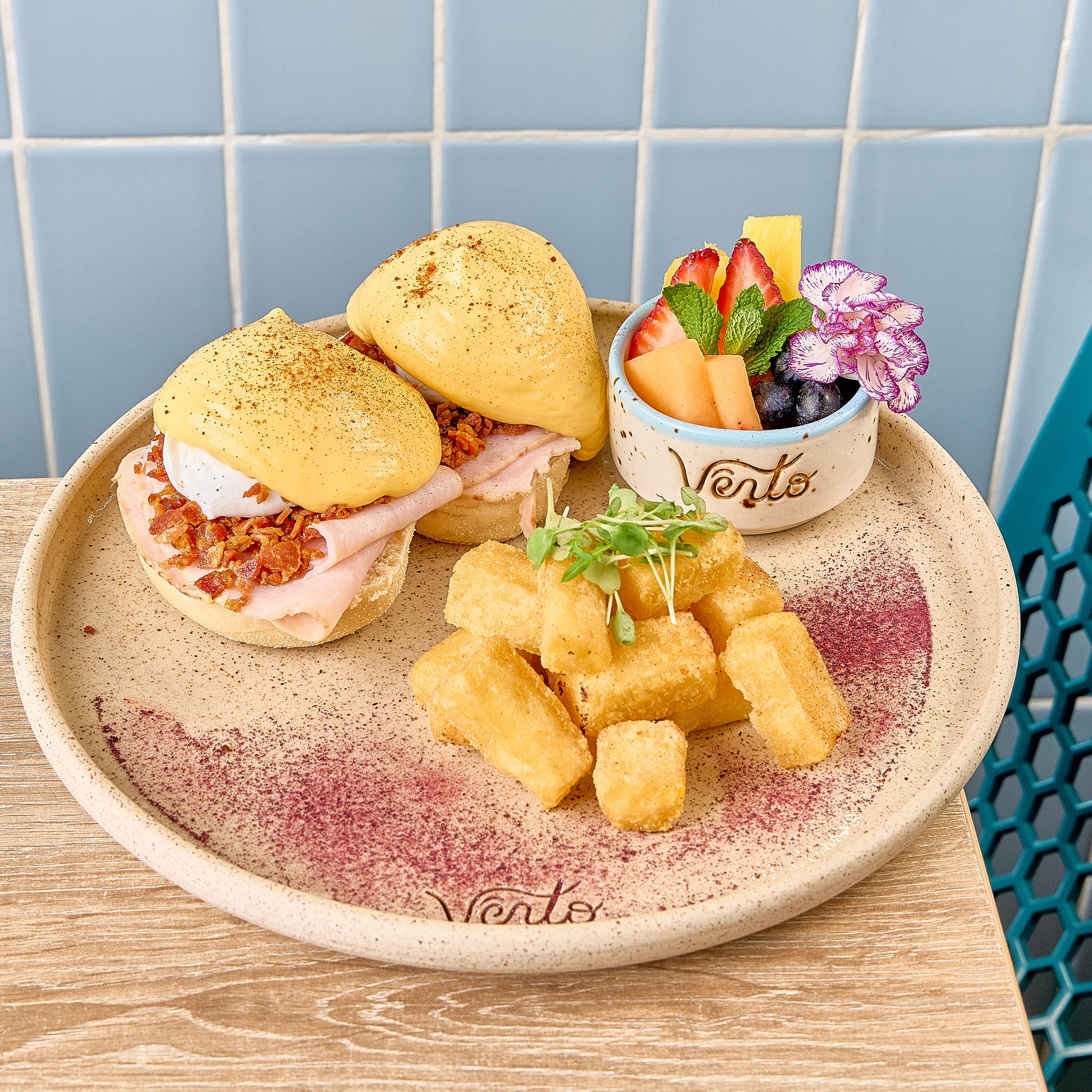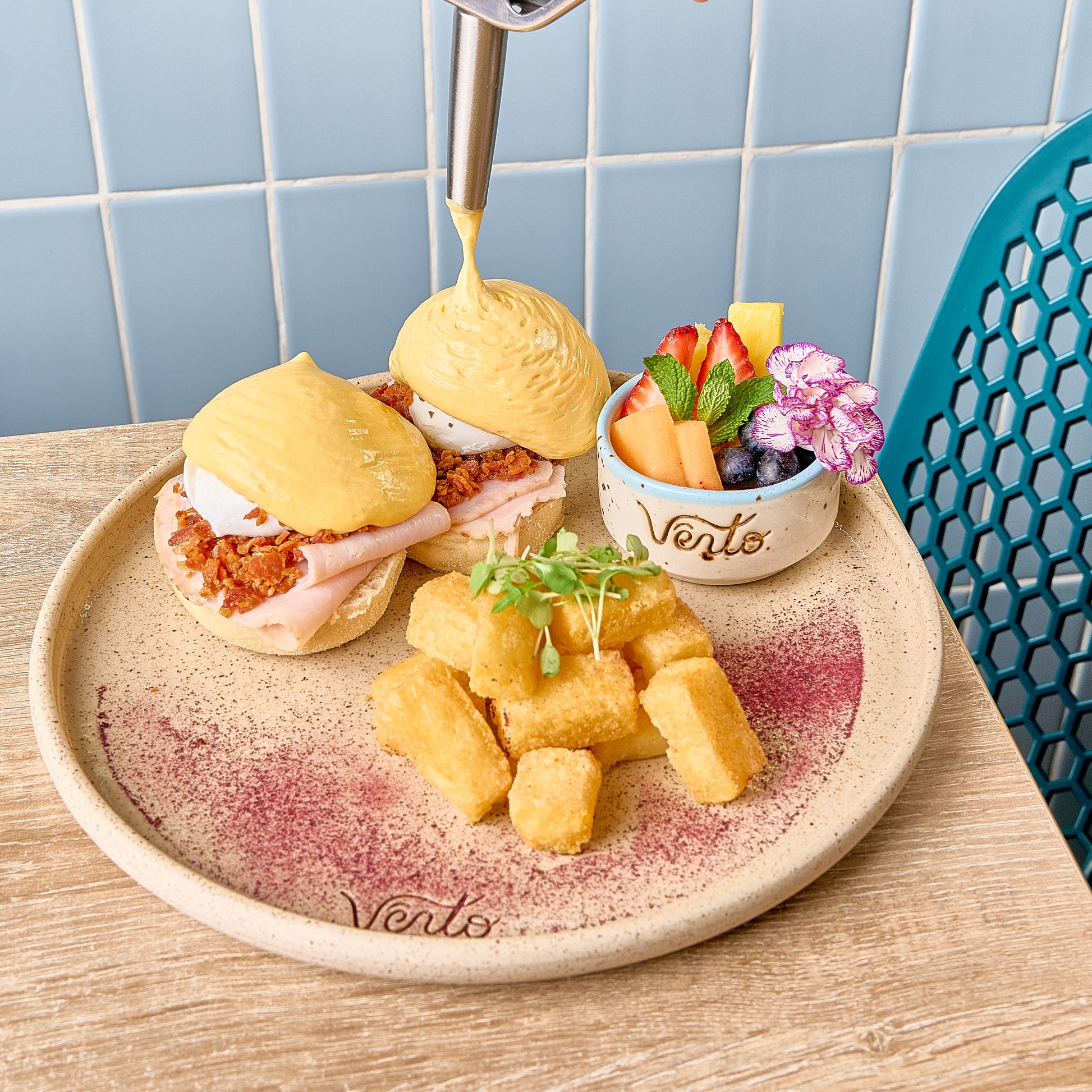 Huevos poché, jamón de pechuga de pavo, topping de tocineta, muffin inglés, holandesa, papitas hash & fruta de temporada.