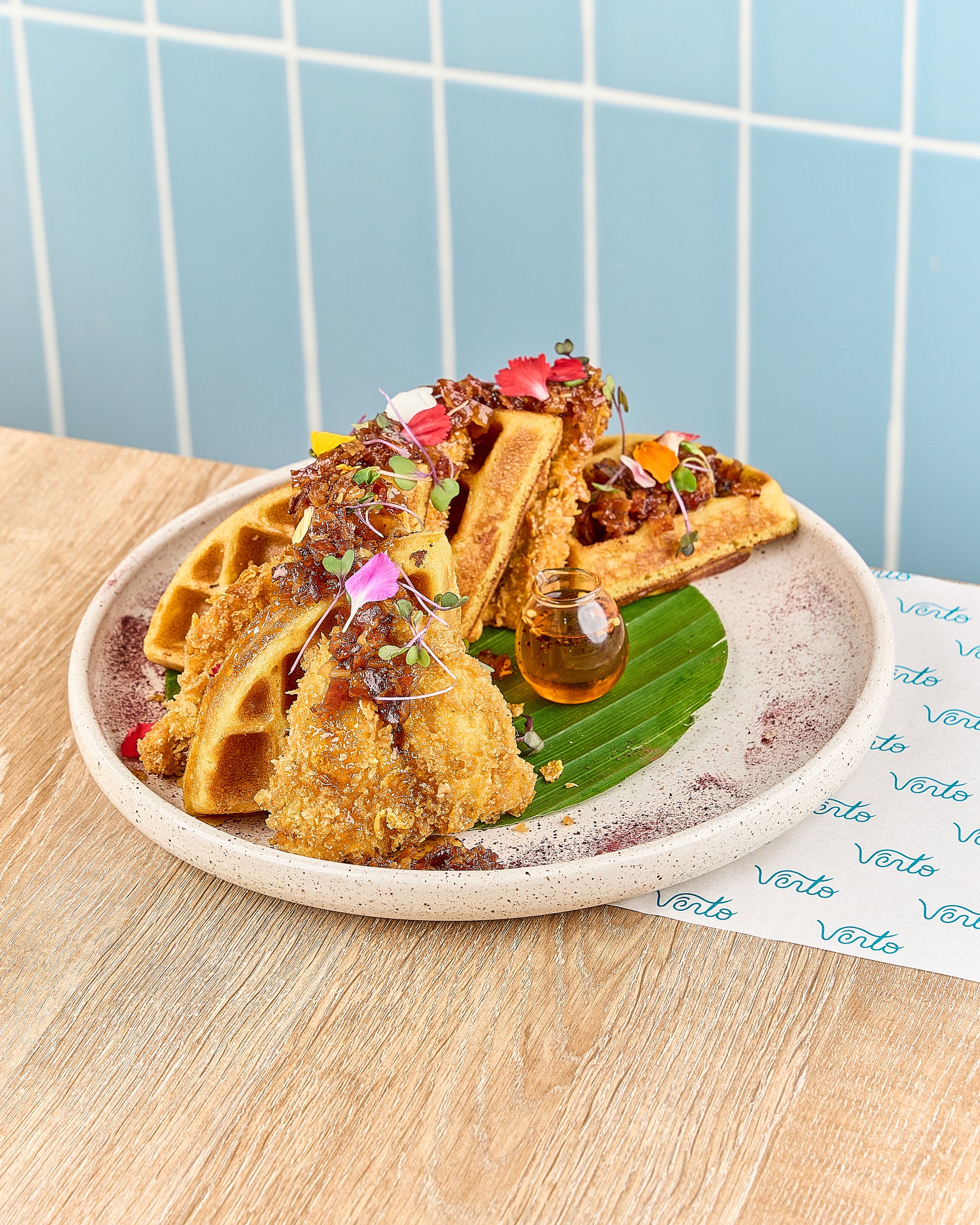 Pollo crispy, mermelada de tocineta, queso crema, polvo de chicharrón & sirope de miel con peperonccino.