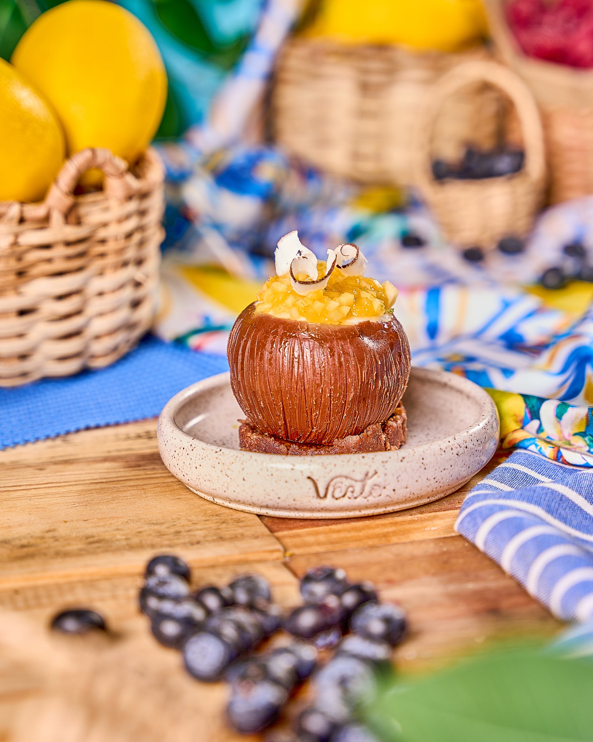 Exótico y cremoso. Ganache de queso Philadelphia con coco, compota de piña y mango, cobertura de chocolate, mango confitado y crumble de cacao.