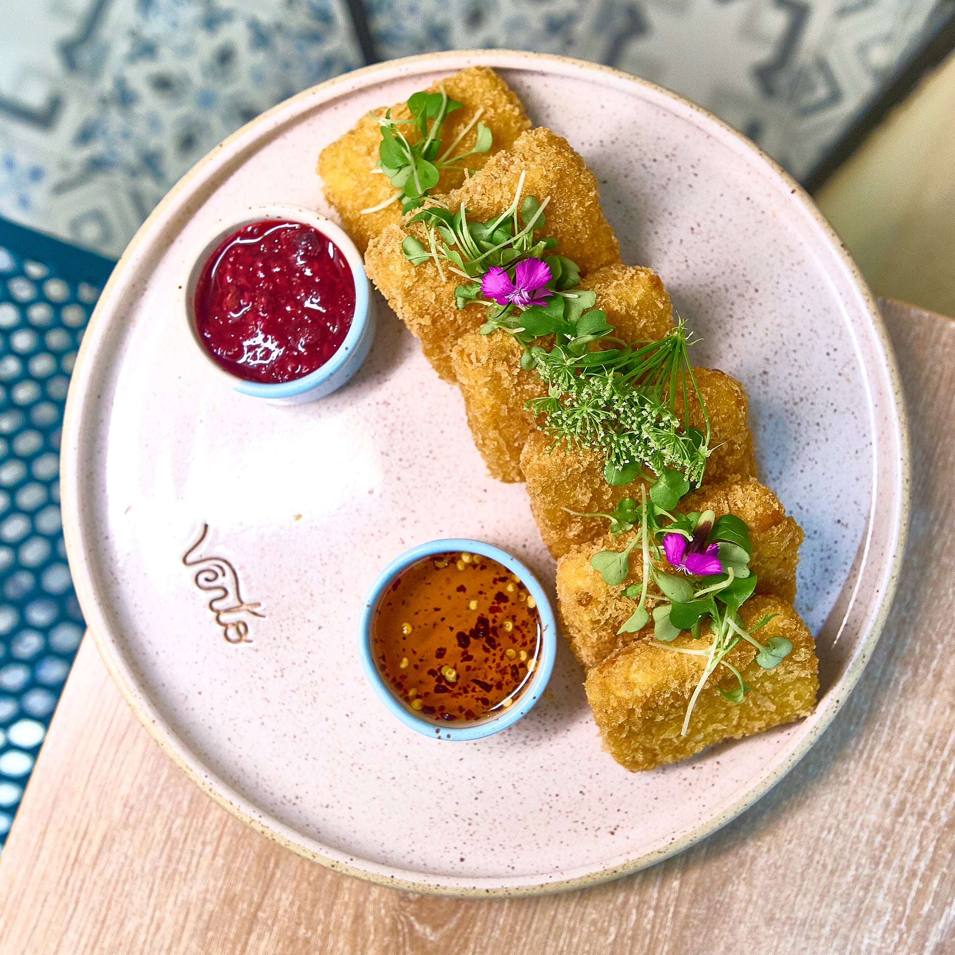 Cubitos de queso empanizado y dorado al punto, con mermelada de tocineta para untar. Crocante, meloso y adictivo.