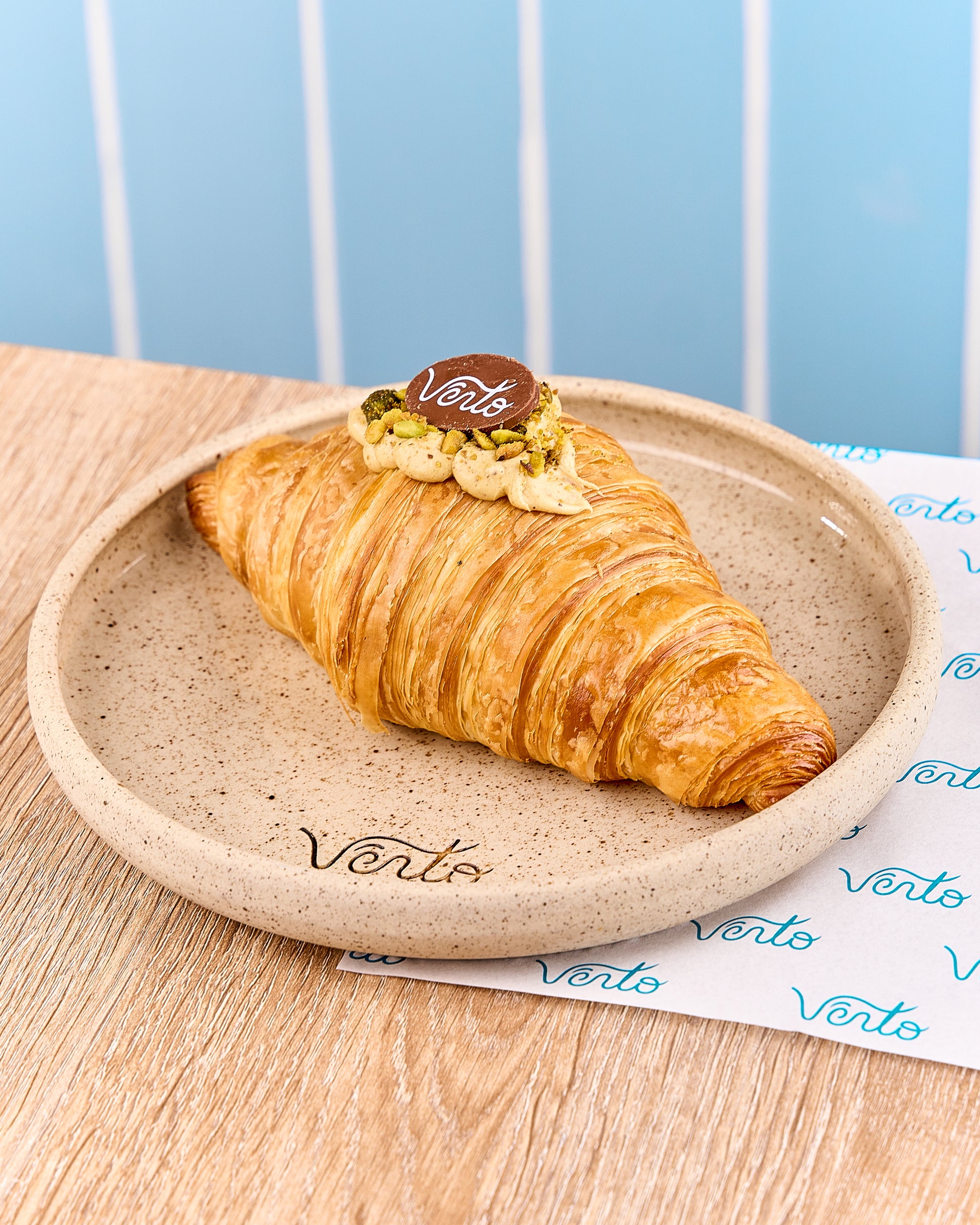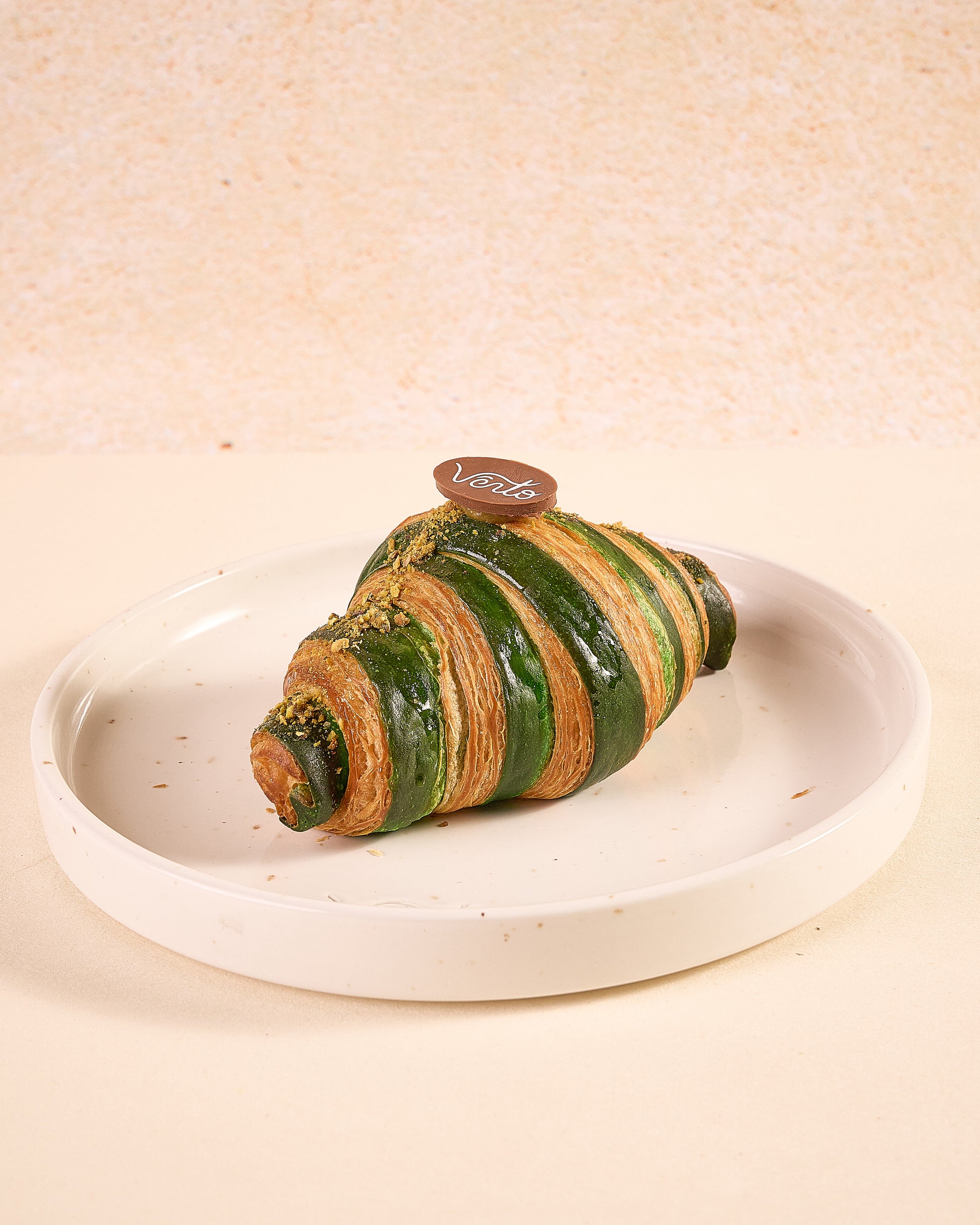 Hojaldre artesanal con relleno de crema de pistacho y cobertura de pistacho molido. Equilibrio perfecto entre lo dulce y lo tostado.