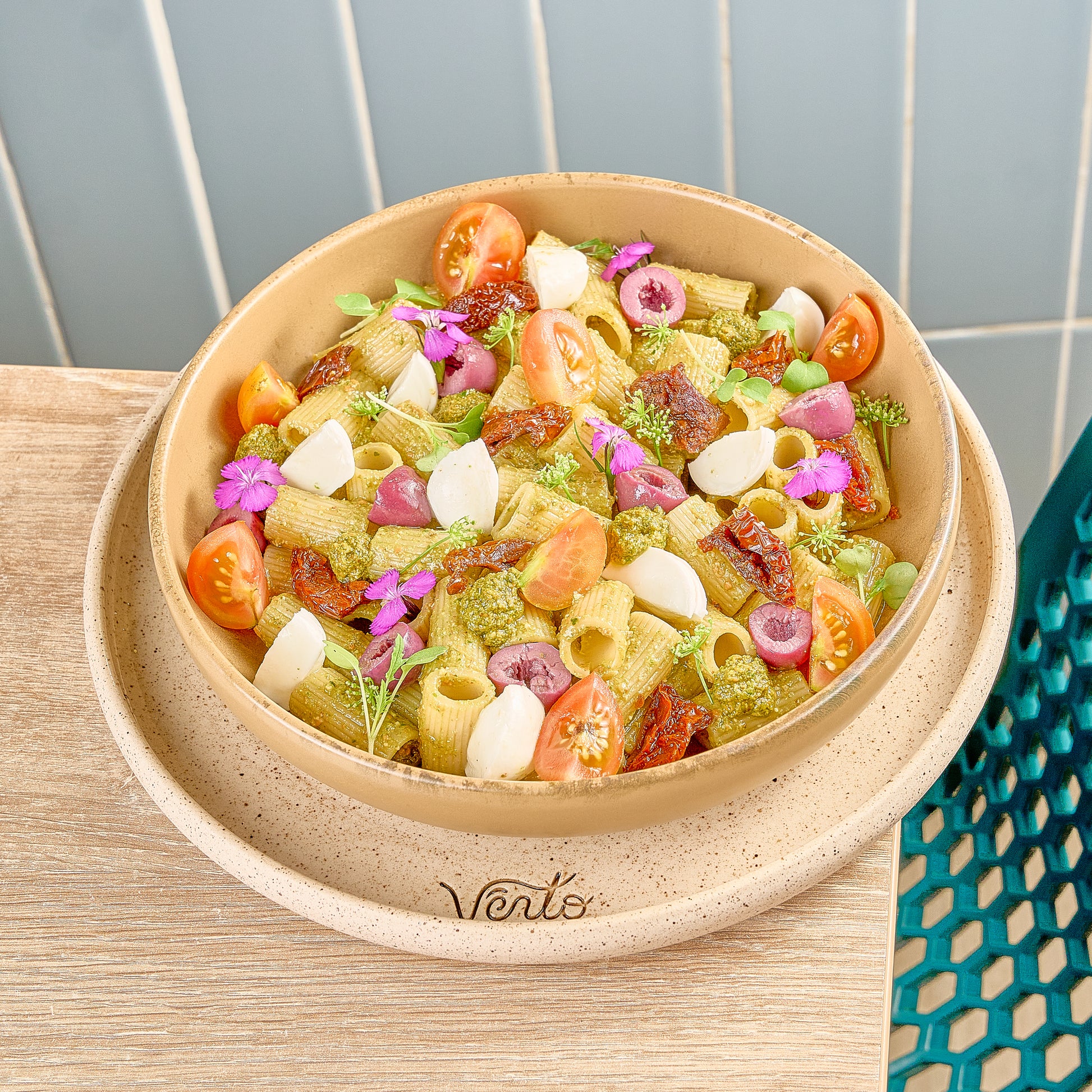 pasta pesto, queso de búfala, tomates cherrys, tomates secos, aceitunas negras & reducción de vinagre balsámico.