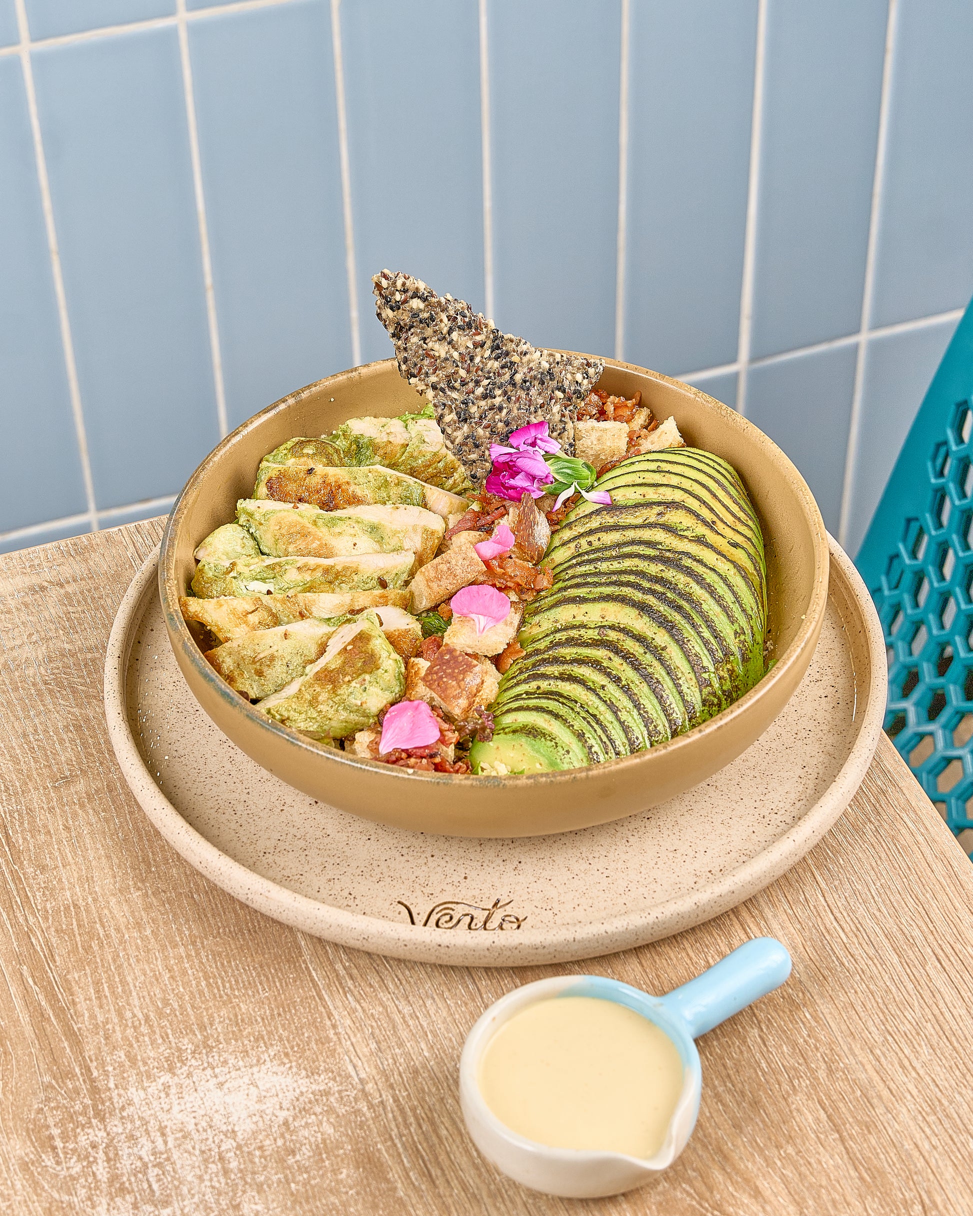 Pollo a la plancha, aguacate tatemado, tocineta crocante, crotones, parmesano y vinagreta de parmesano.
