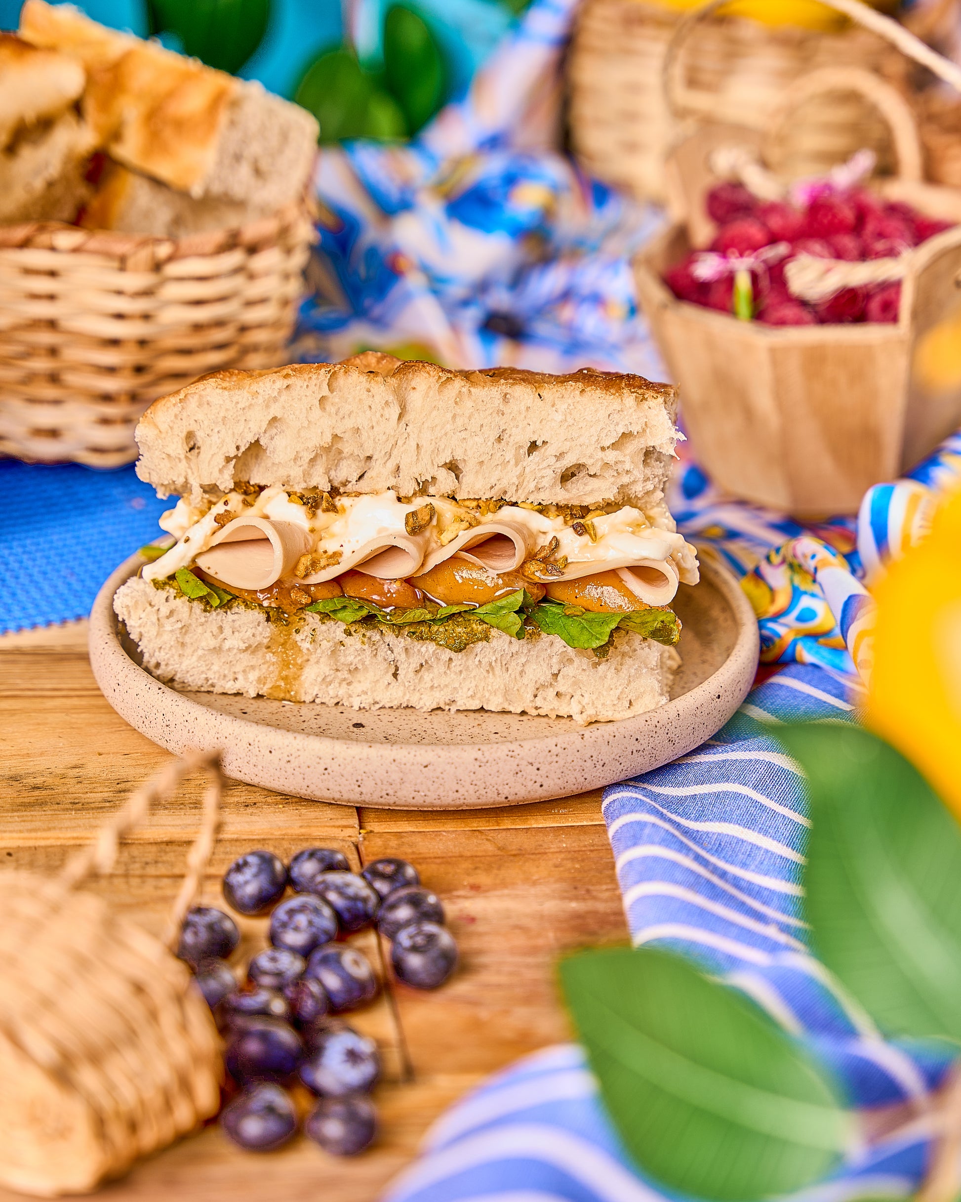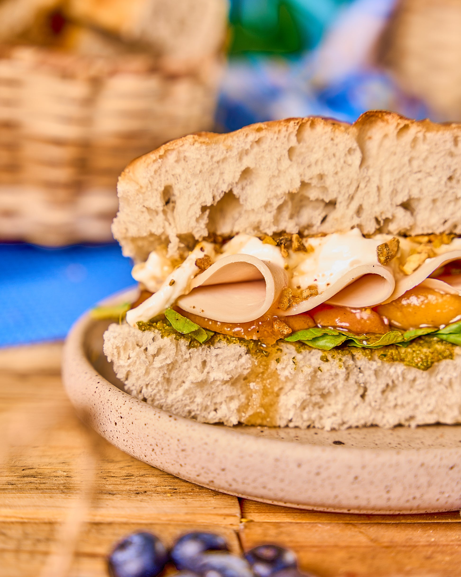 Una focaccia que celebra la elegancia de lo simple con un toque sofisticado. Base de pan focaccia artesanal con pesto de albahaca, rúgula fresca, duraznos asados, mortadela con pistacho, cremosa stracciatella y un delicado hilo de miel con pistachos troceados. Un juego perfecto entre dulzura, salinidad y textura.