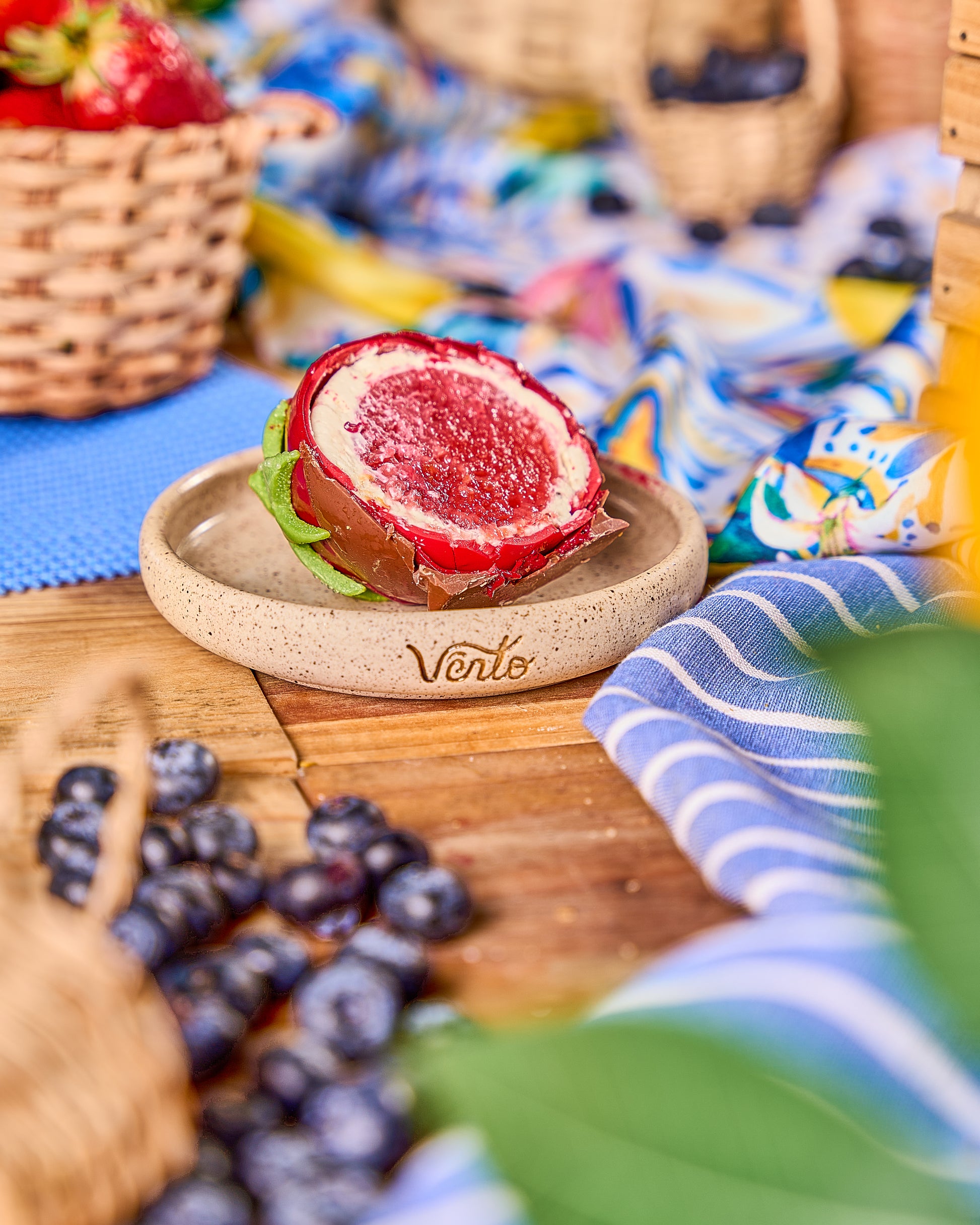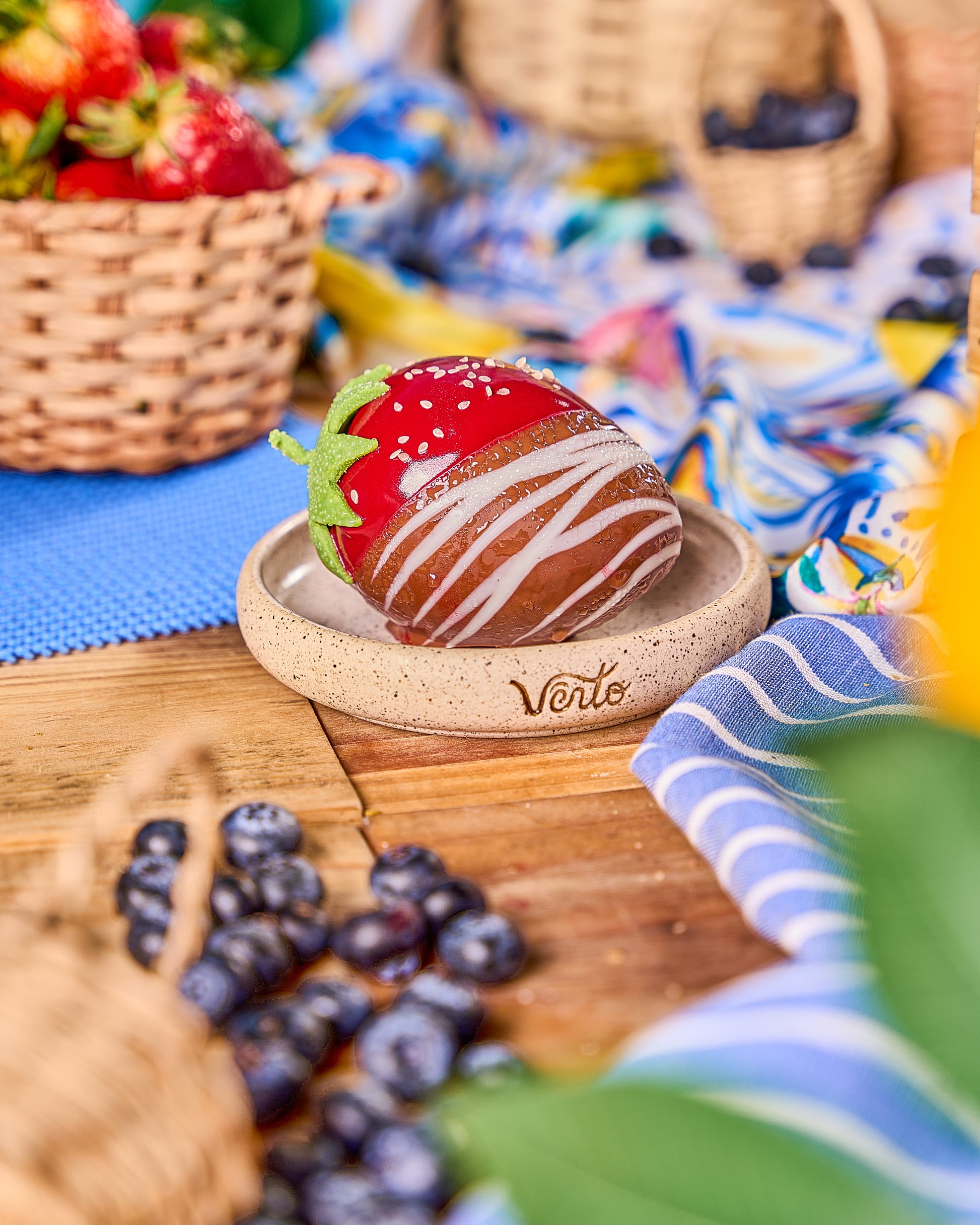 Un clásico renovado. Ganache y gelificado de fresa con albahaca, baño de chocolate brillante y sable de cacao.