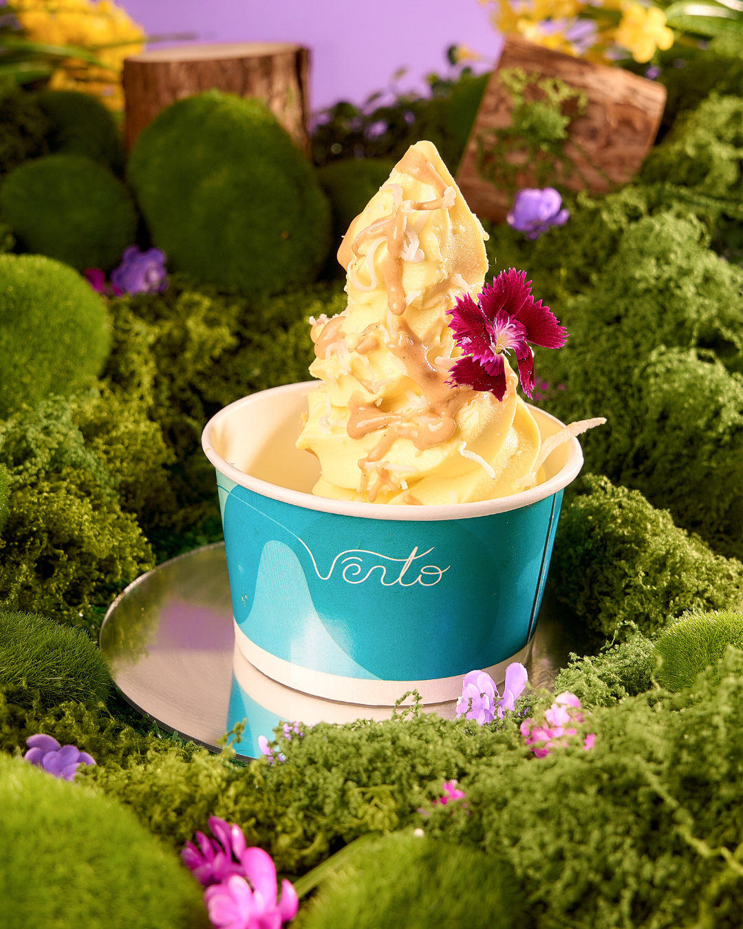 Helado de frutos amarillos acompañado de coco tostado y una suave crema de marañón que aporta un toque cremoso y delicado.