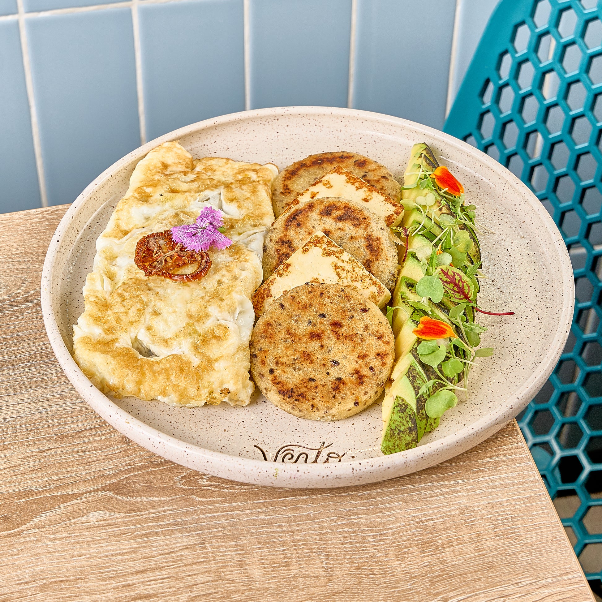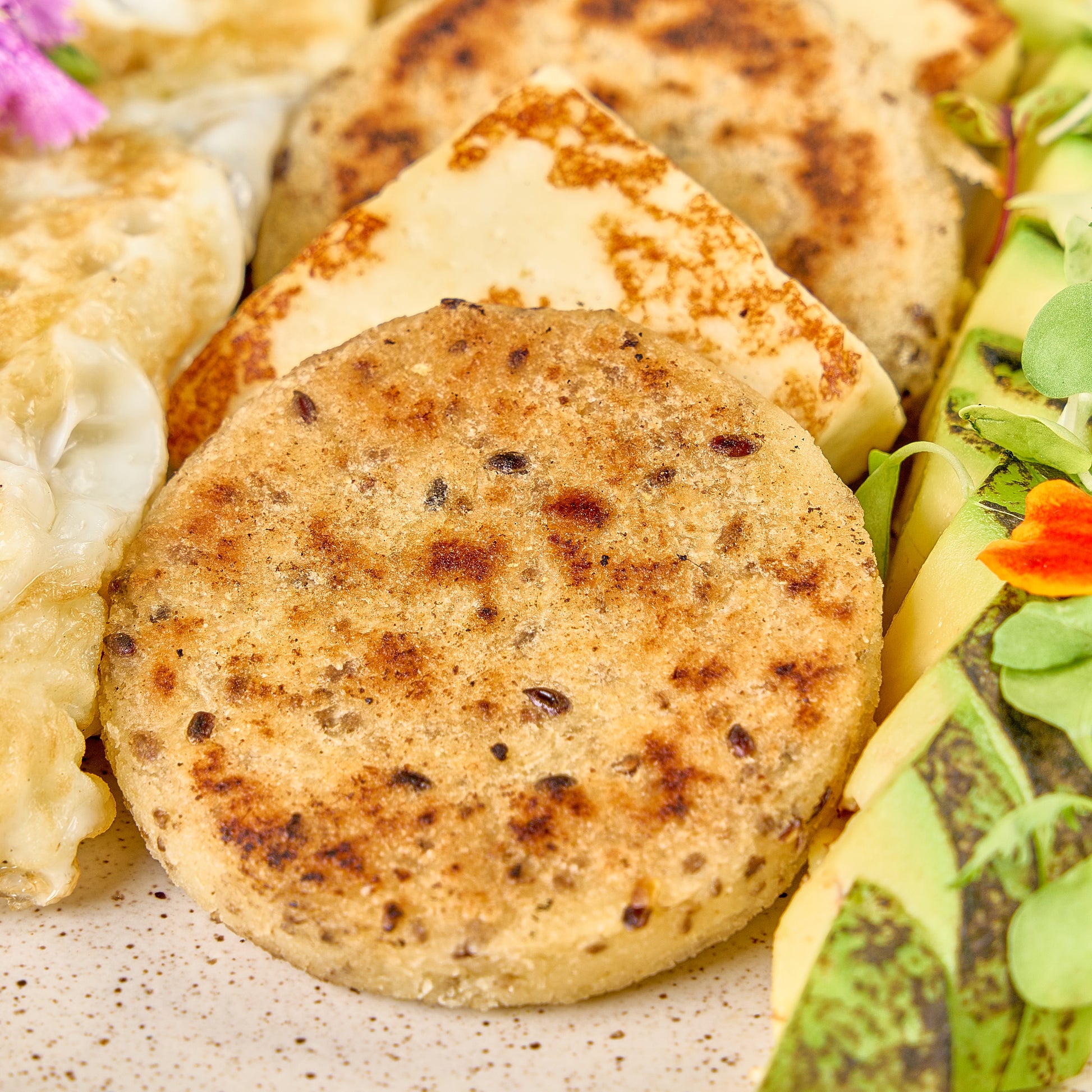 Omelette de claras con champiñones & jamón de pavo, aguacate, queso asado & arepitas de semillas.