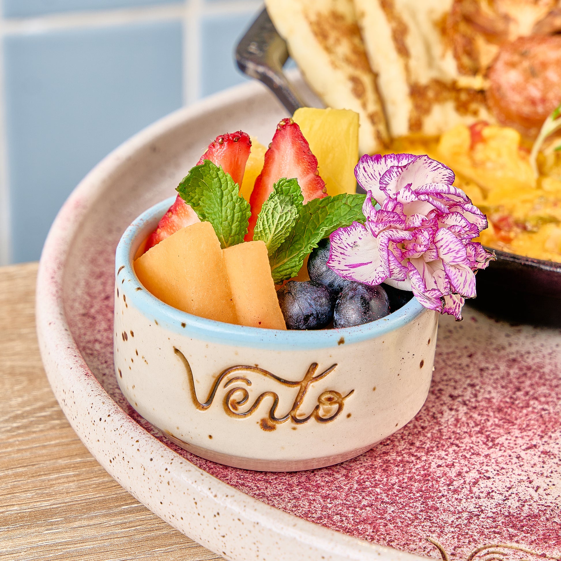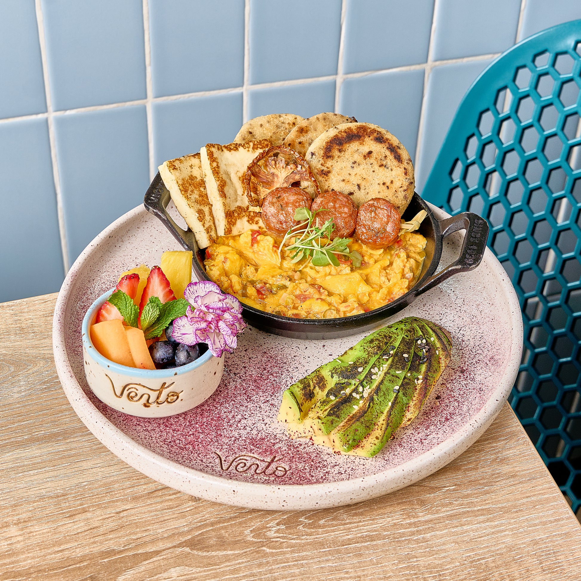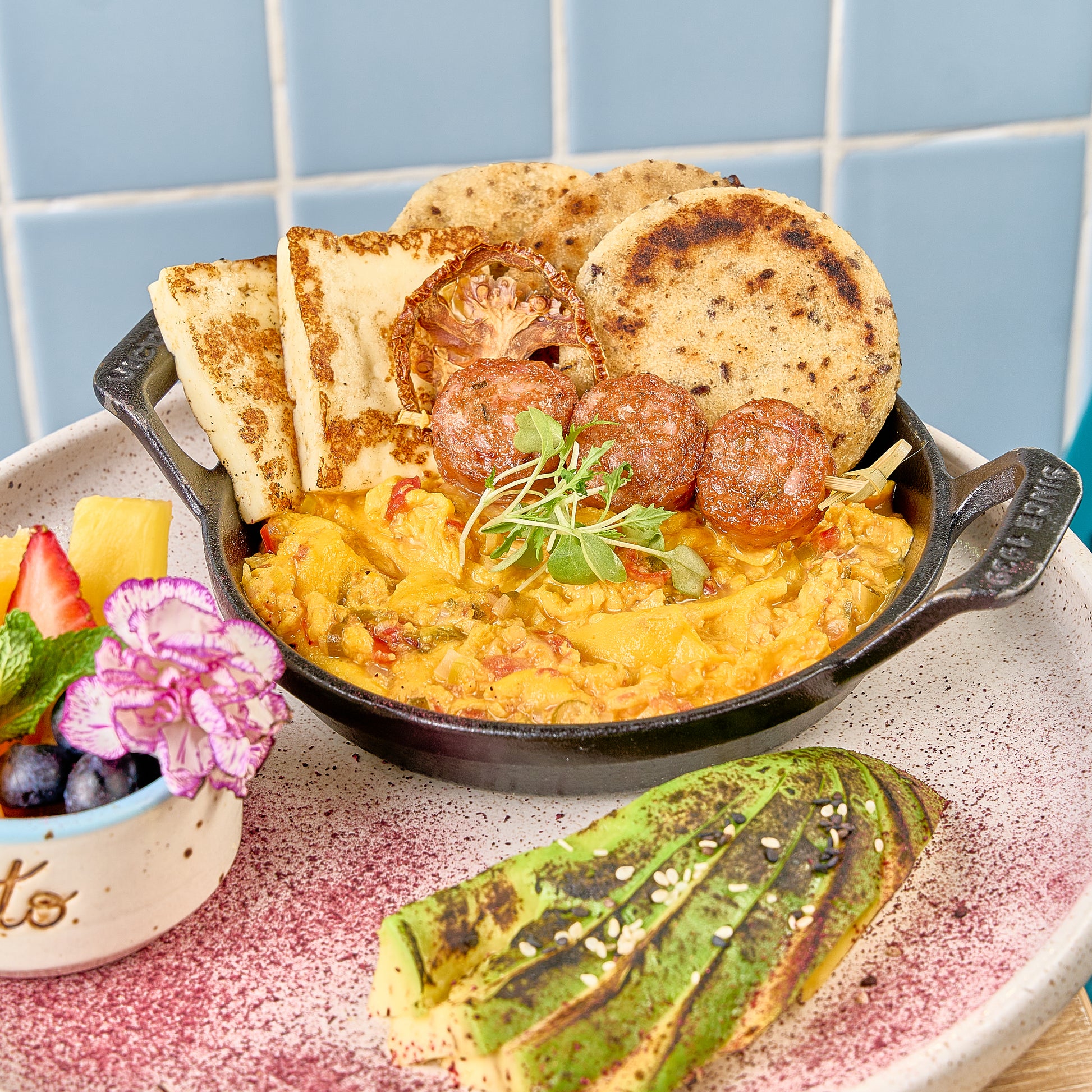 Huevos pericos, arepitas de semillas, queso asado, aguacate, chorizo santarrosano & fruta de temporada.