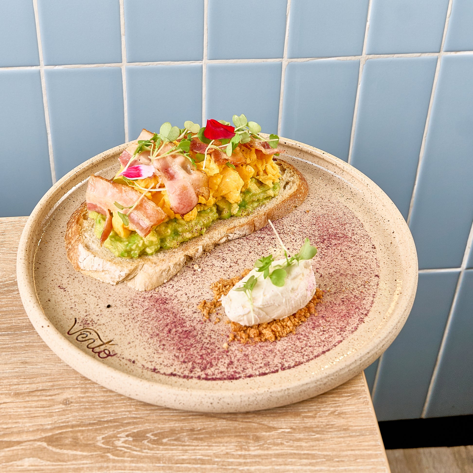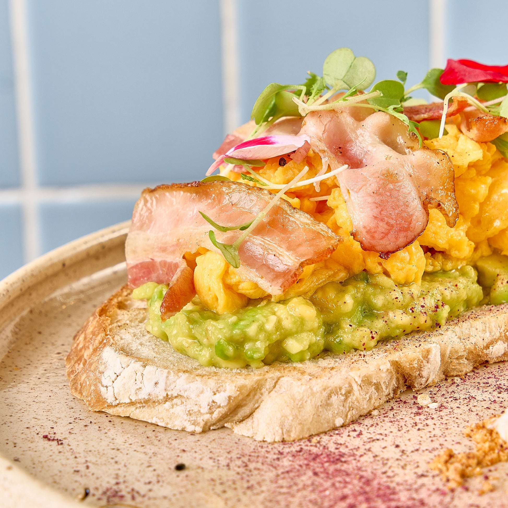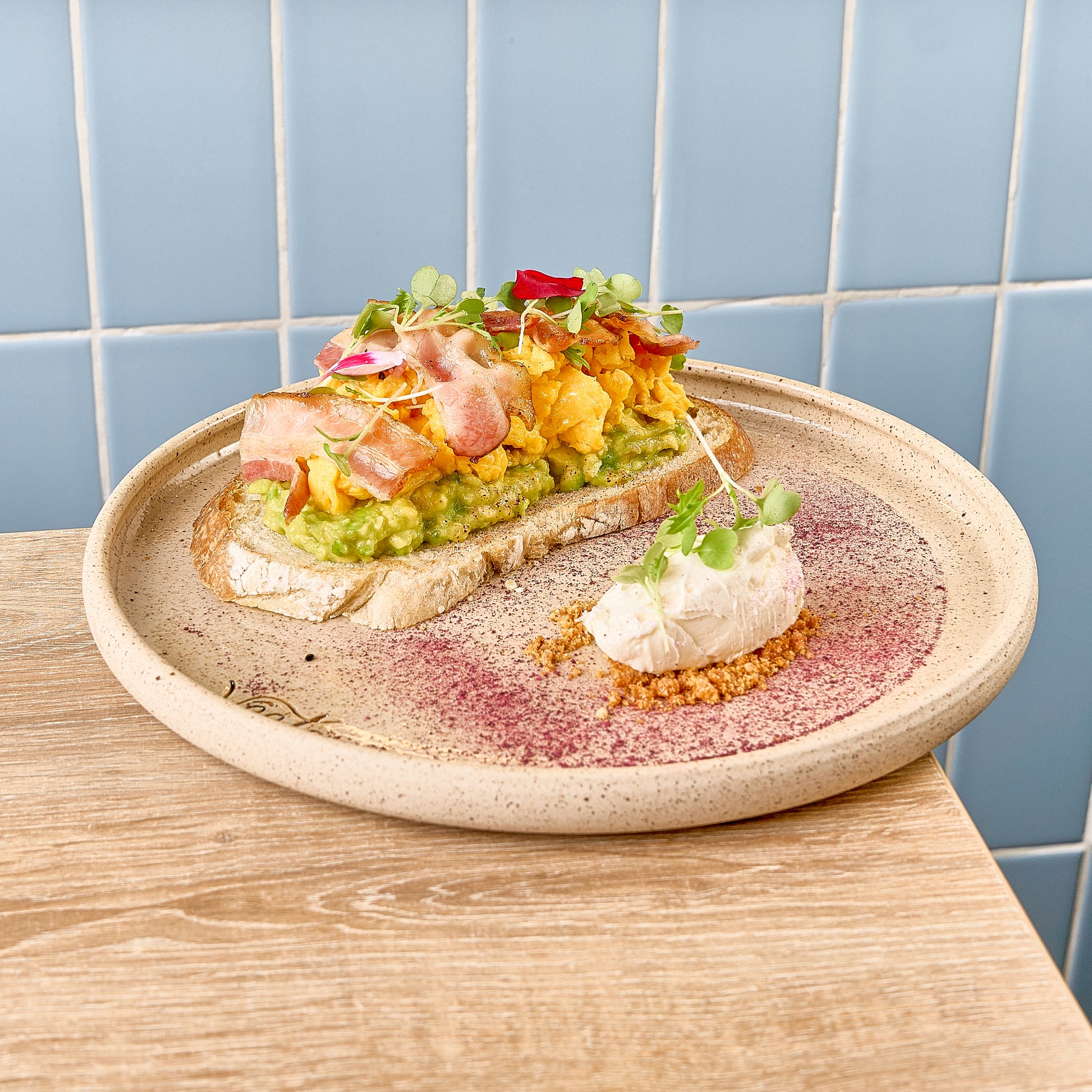 Huevos revueltos cremosos, tocineta crocante, puré de aguacate sobre pan de masa madre & quenelle de queso crema con borde de chicharrón.