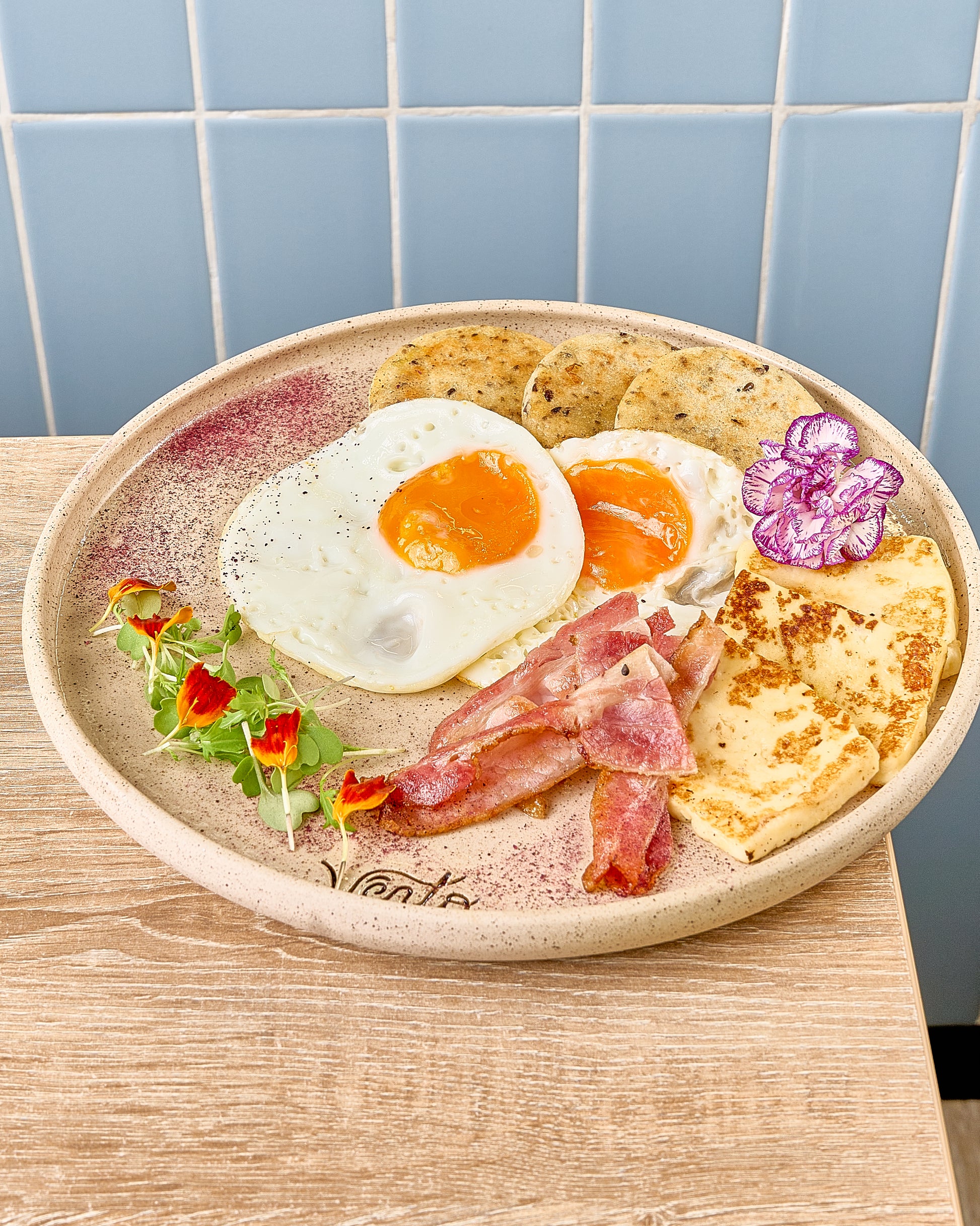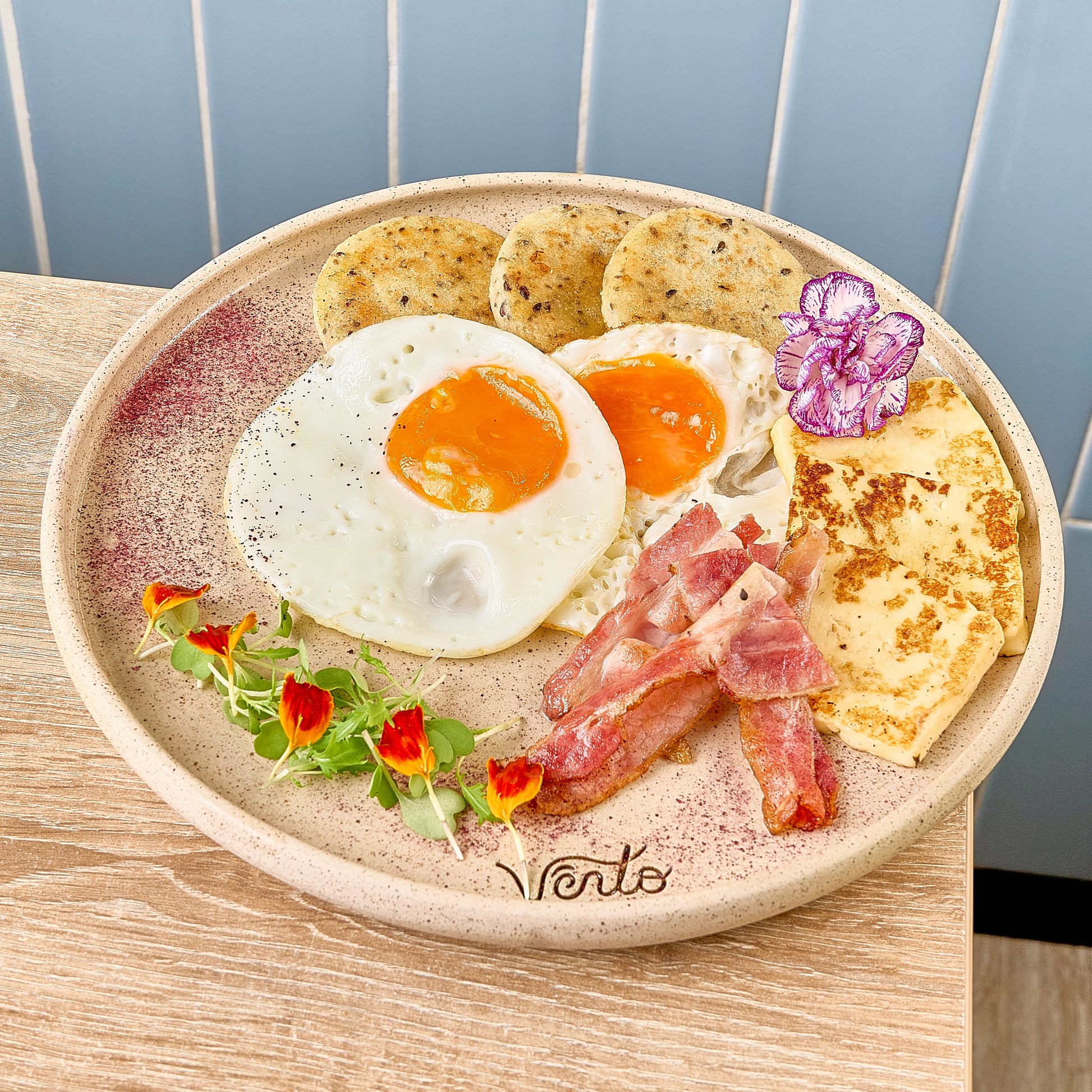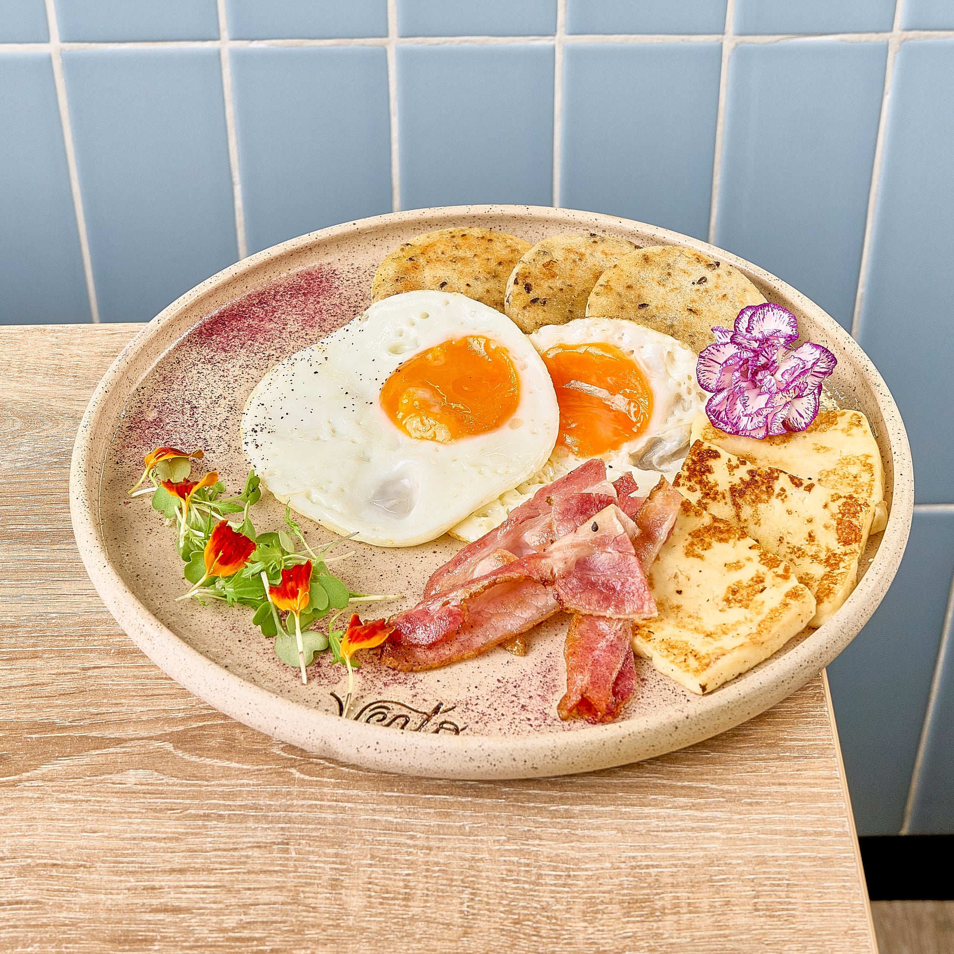 Huevos fritos, tocineta, queso asado & arepitas de semillas.