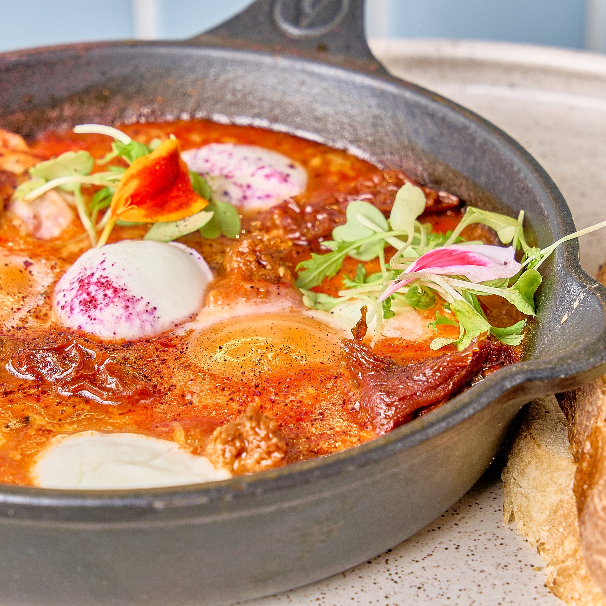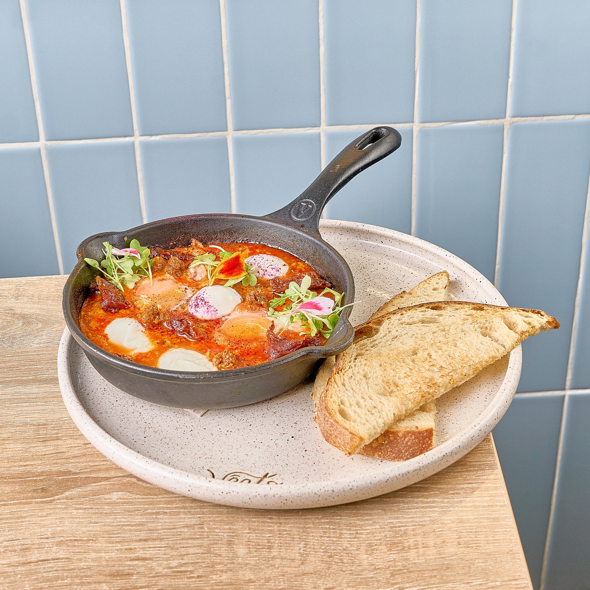 Huevos en salsa napolitana, queso mozzarella de búfala, tomates secos & queso parmesano, con tostadas de pan de masa madre.