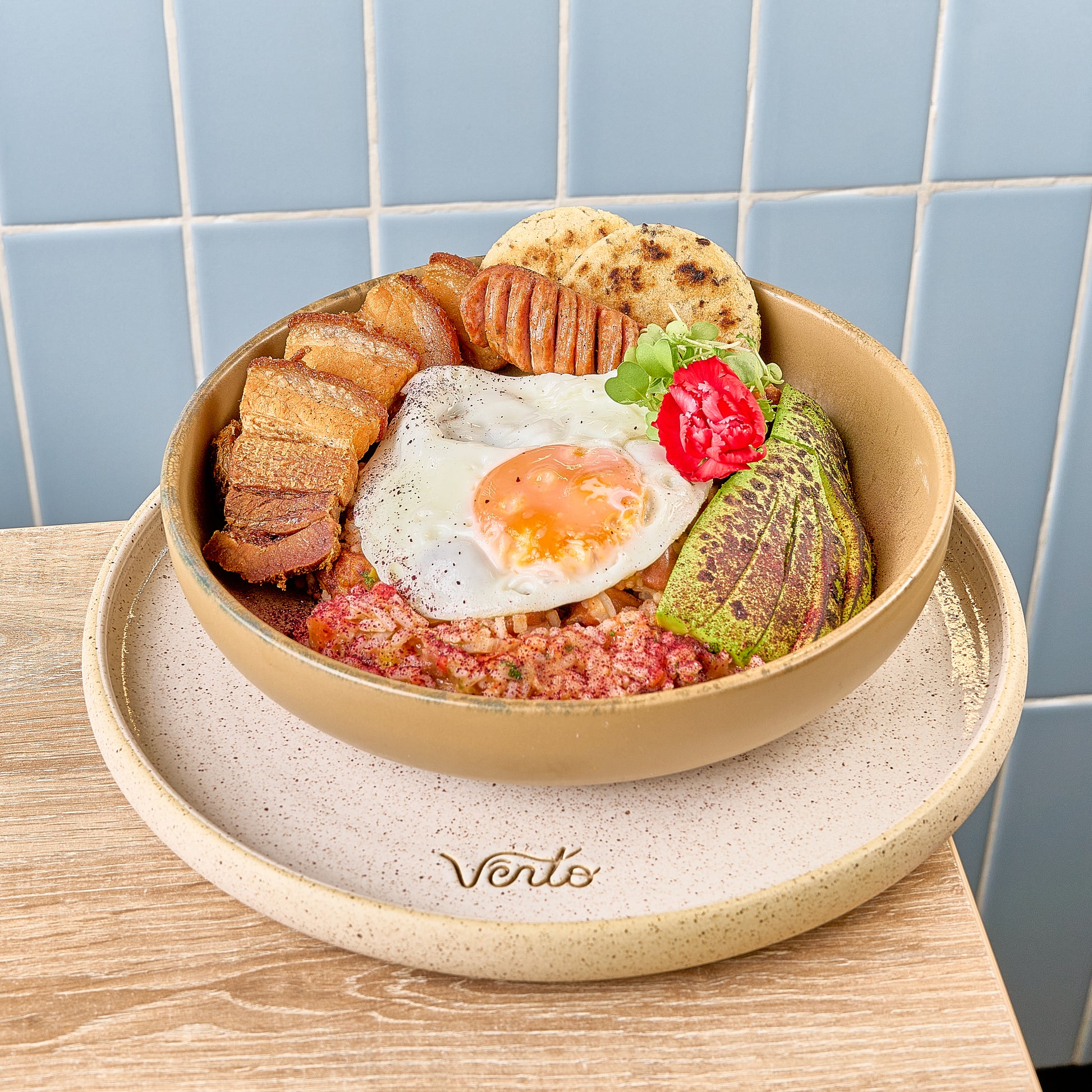Calentado de arroz, frijoles y maduritos, aguacate tatemado, chorizo, chicharrón y arepitas de semillas.