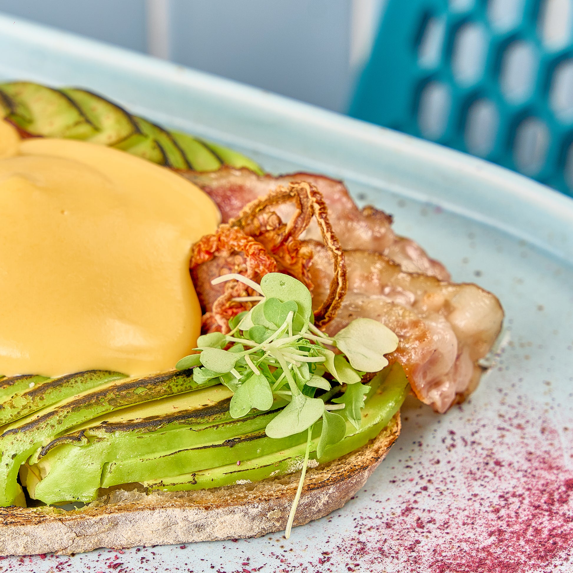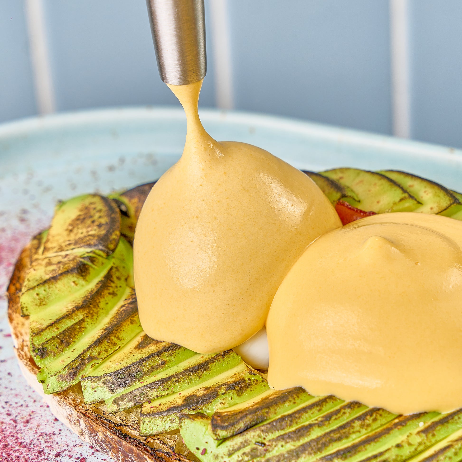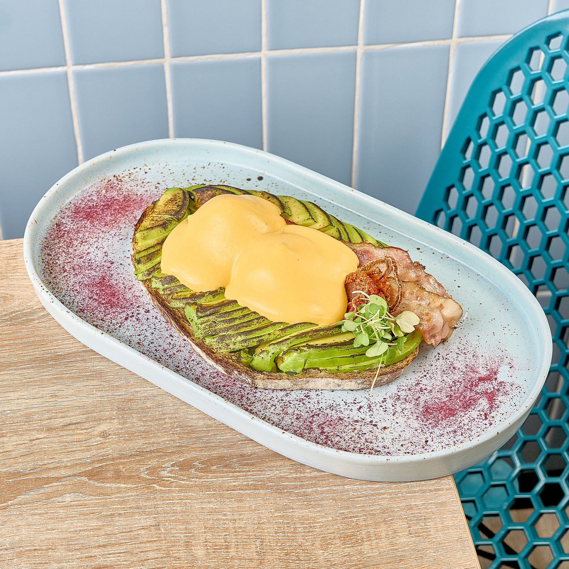 Huevos poché, tocineta y aguacate flameado sobre pan de masa madre, salsa holandesa servida en sifón y queso parmesano.