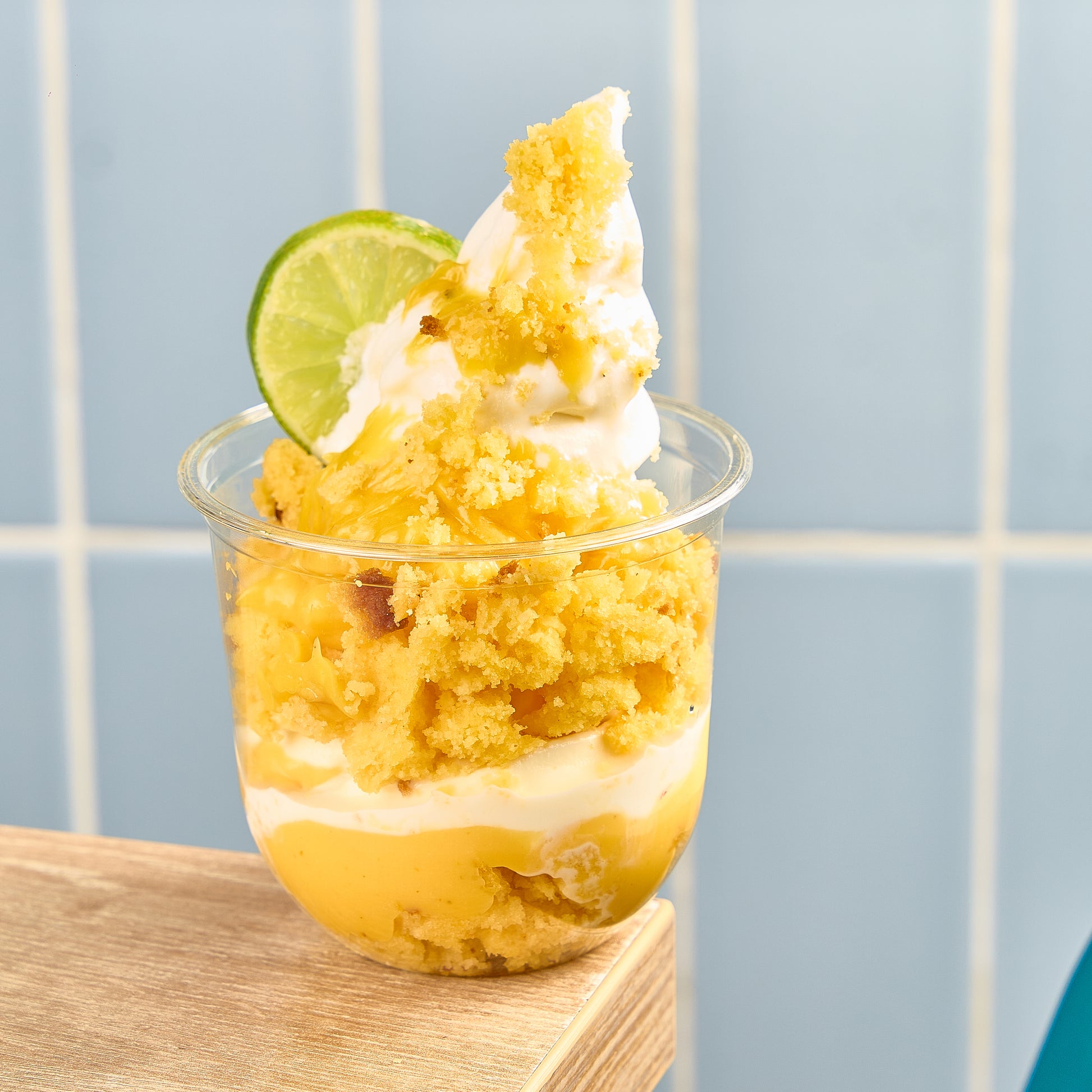 Trozos de bizcocho de limón, crocante de merengue & crema de limón.