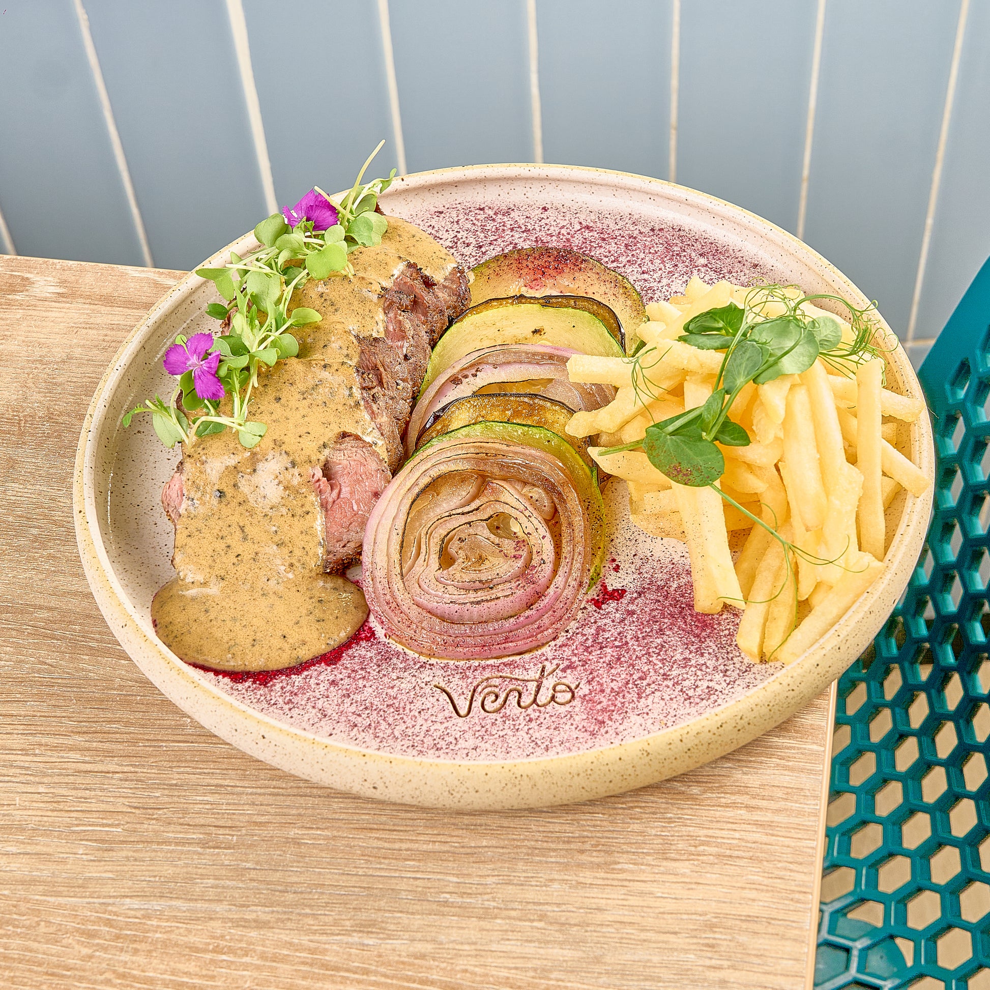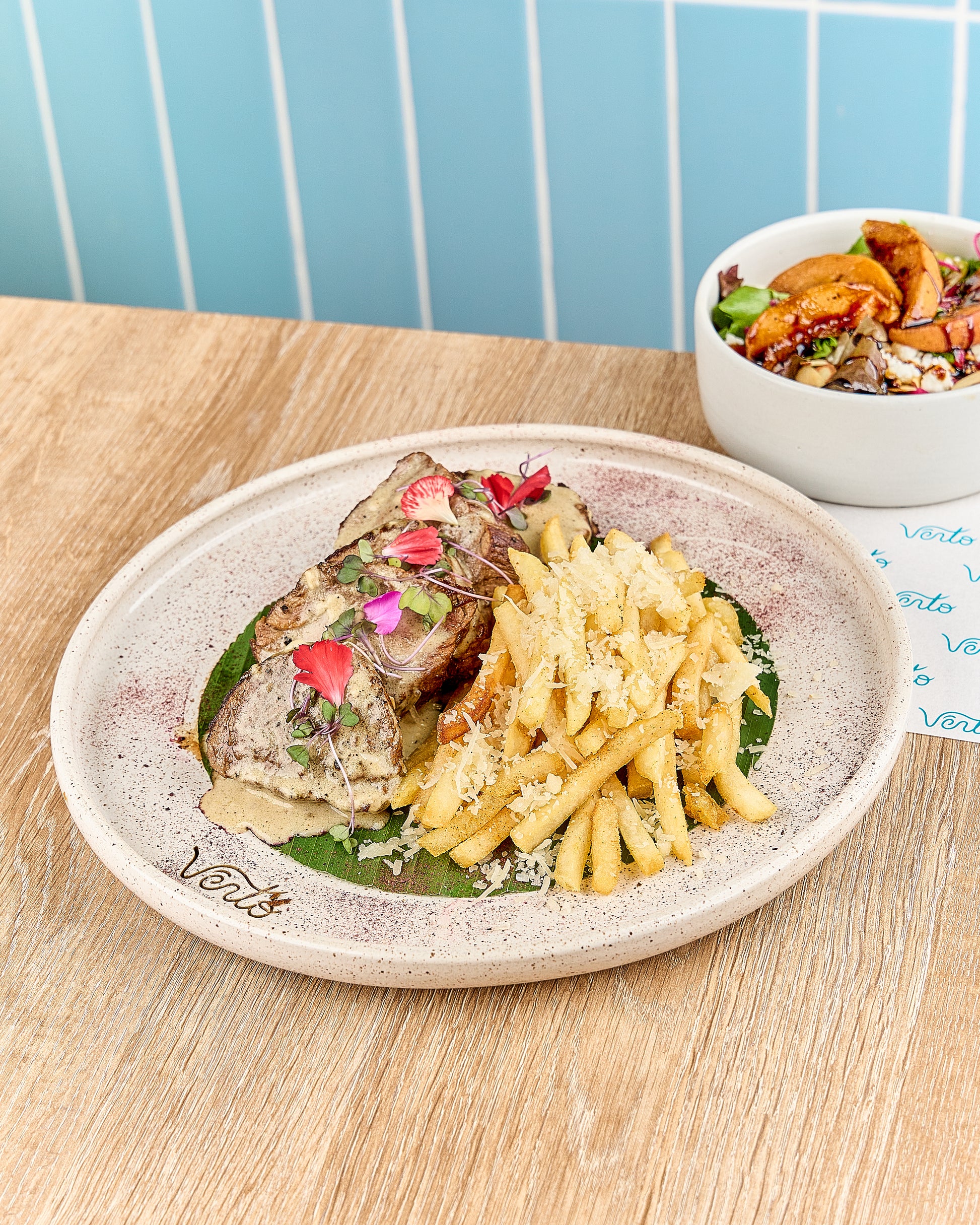 Lomito de res en salsa cremosa de pimienta, vegetales calientes y papas fritas con parmesano.