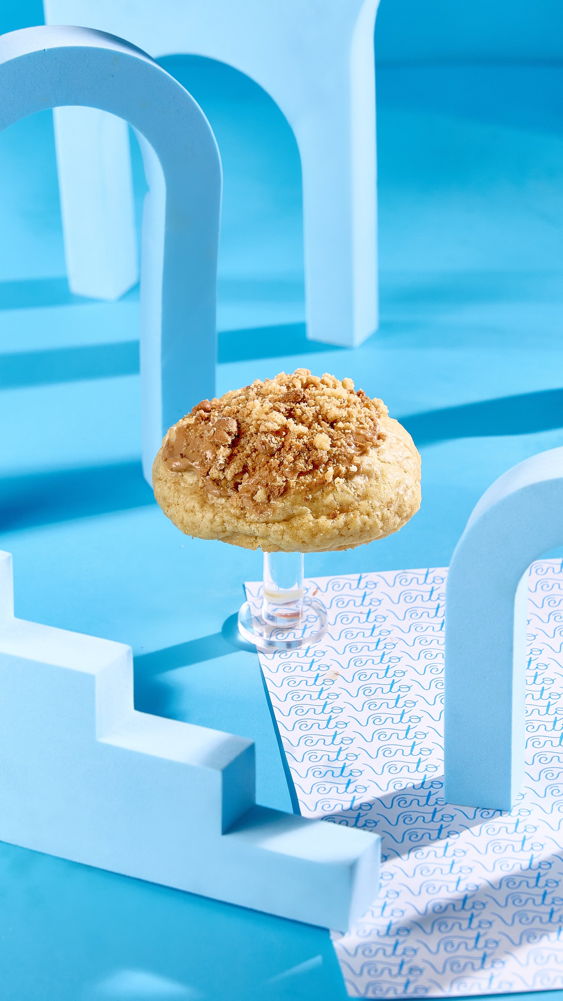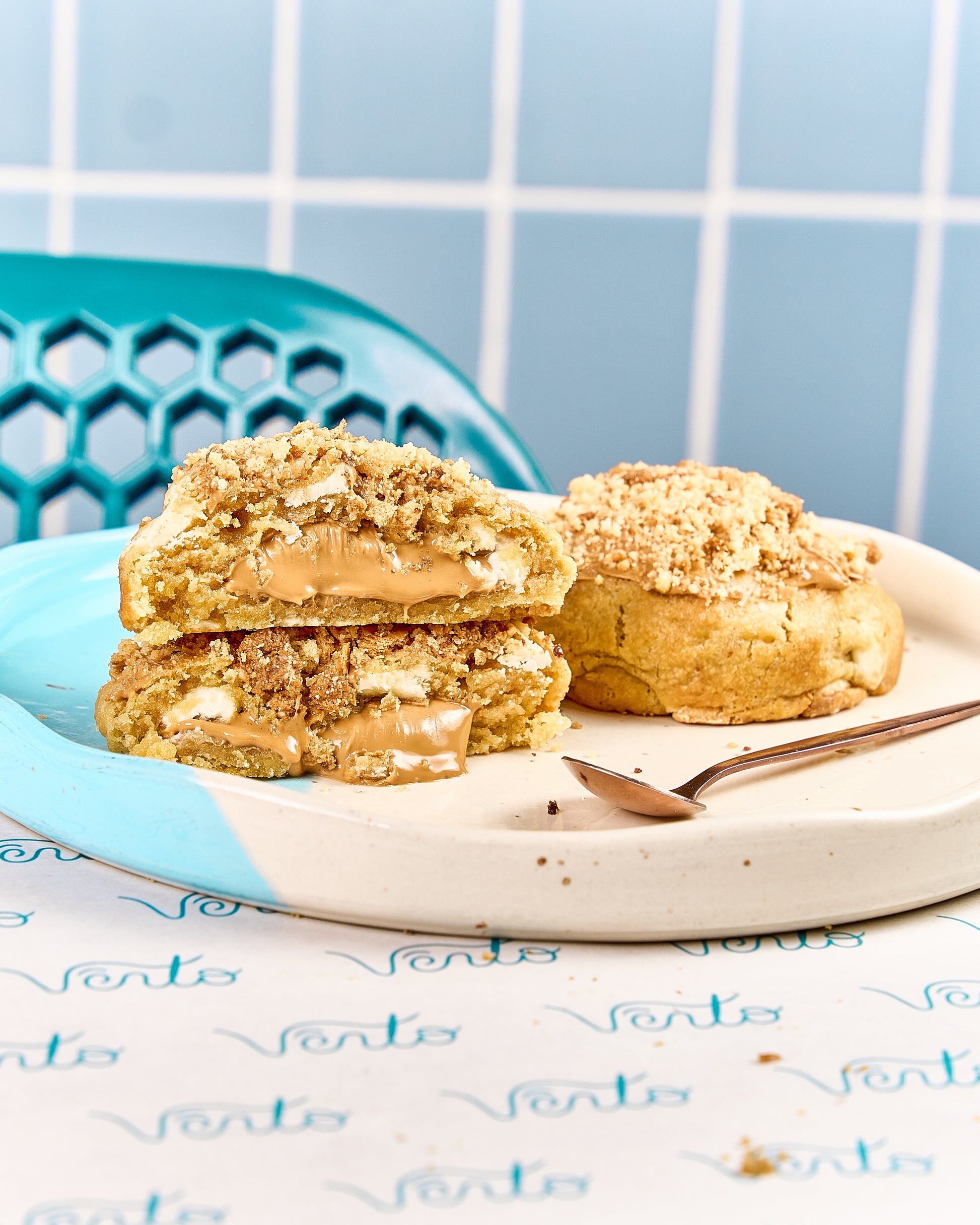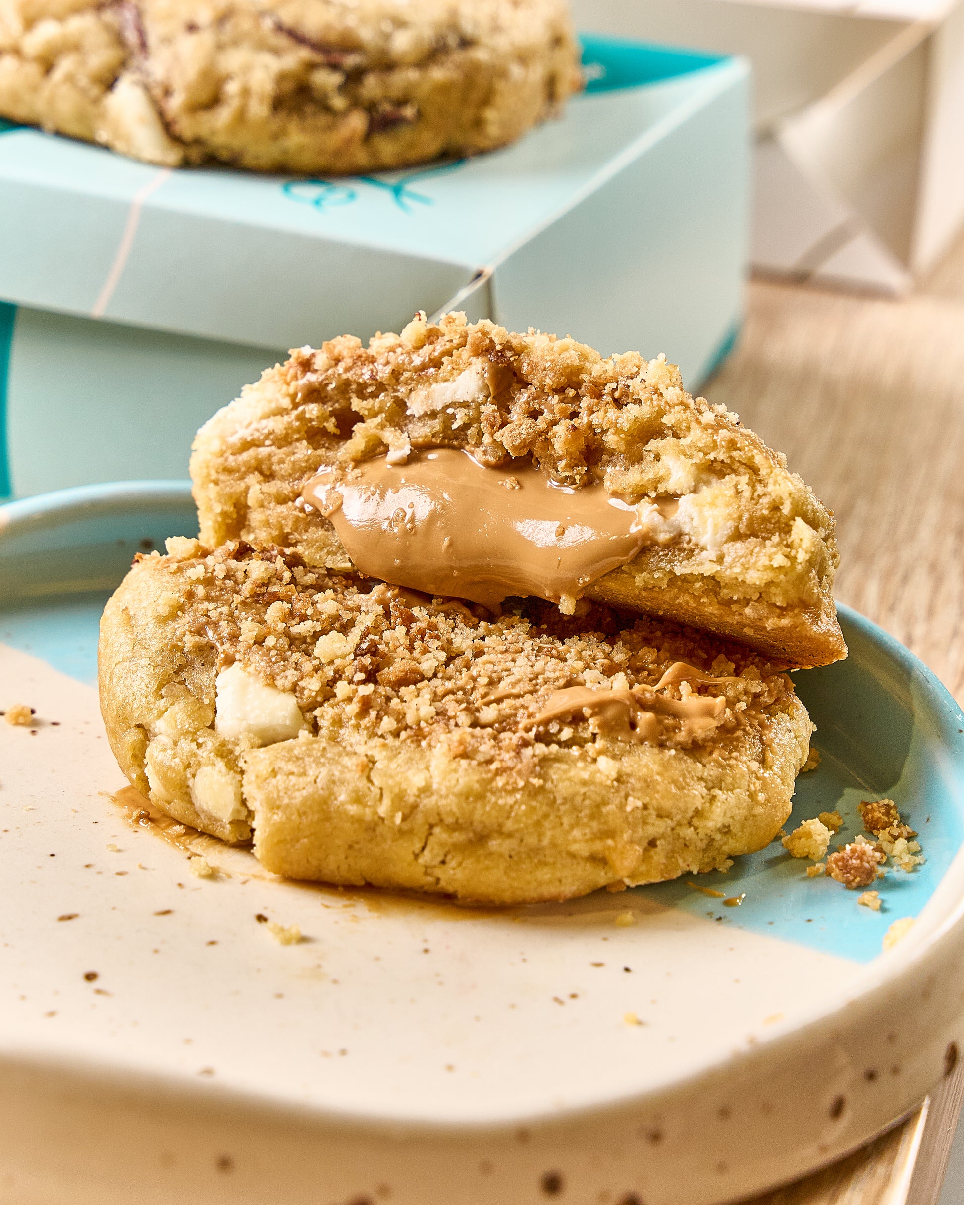Masa de vainilla con trozos de chocolate blanco, rellena de crema Lotus Biscoff y cubierta con crumble de galleta.