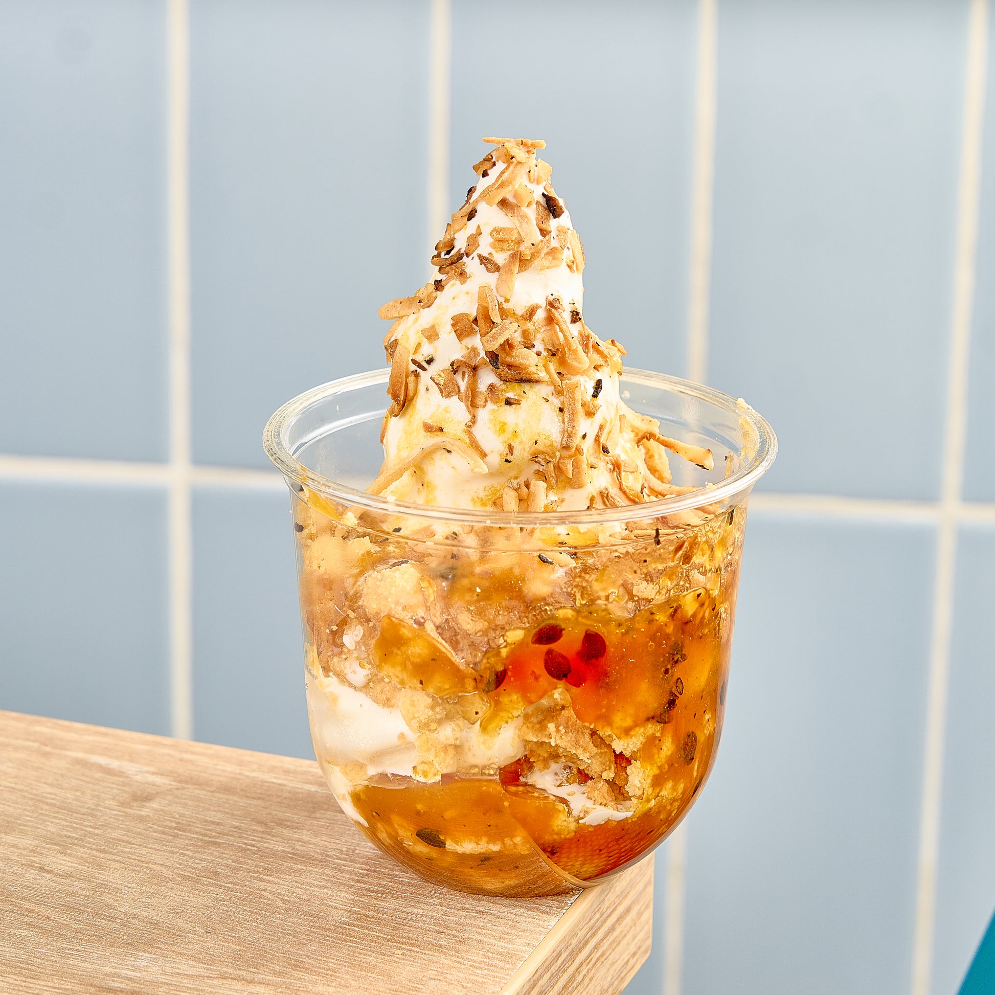 crumble de vainilla, coulis de frutos amarillos, mermelada de maracuyá & coco tostado
