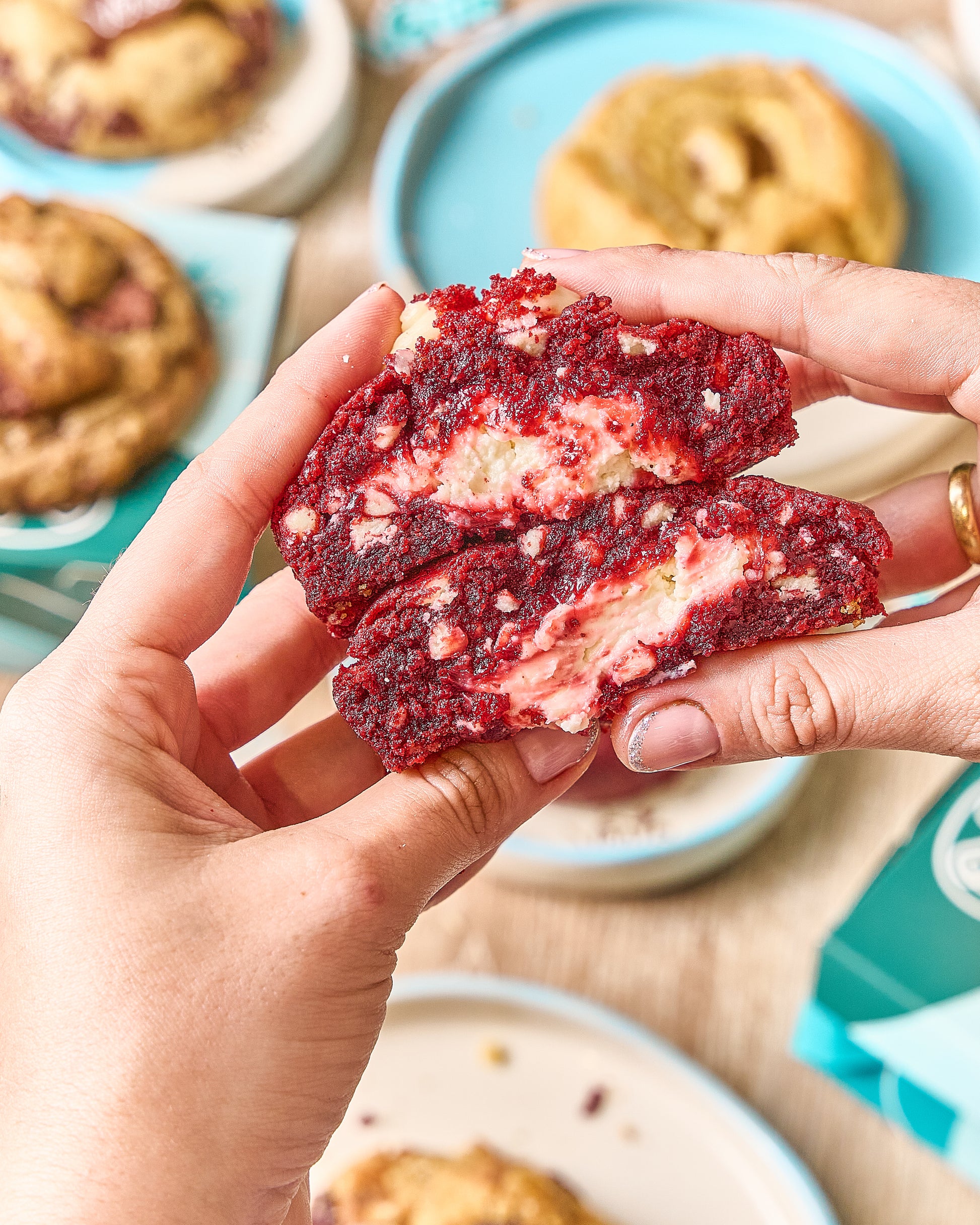 Masa red velvet con puntos de chocolate blanco, relleno de queso crema y miga de bizcocho red velvet.