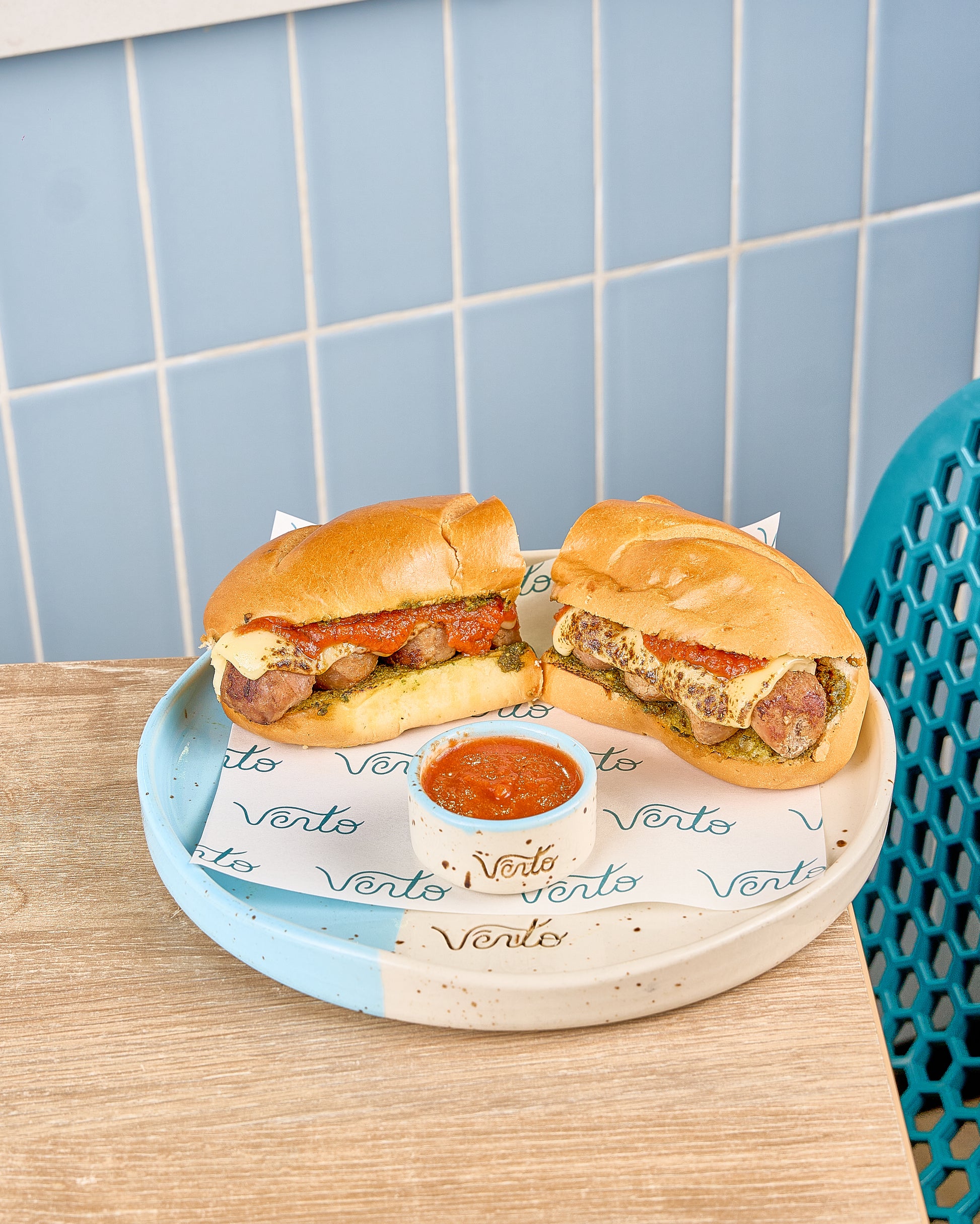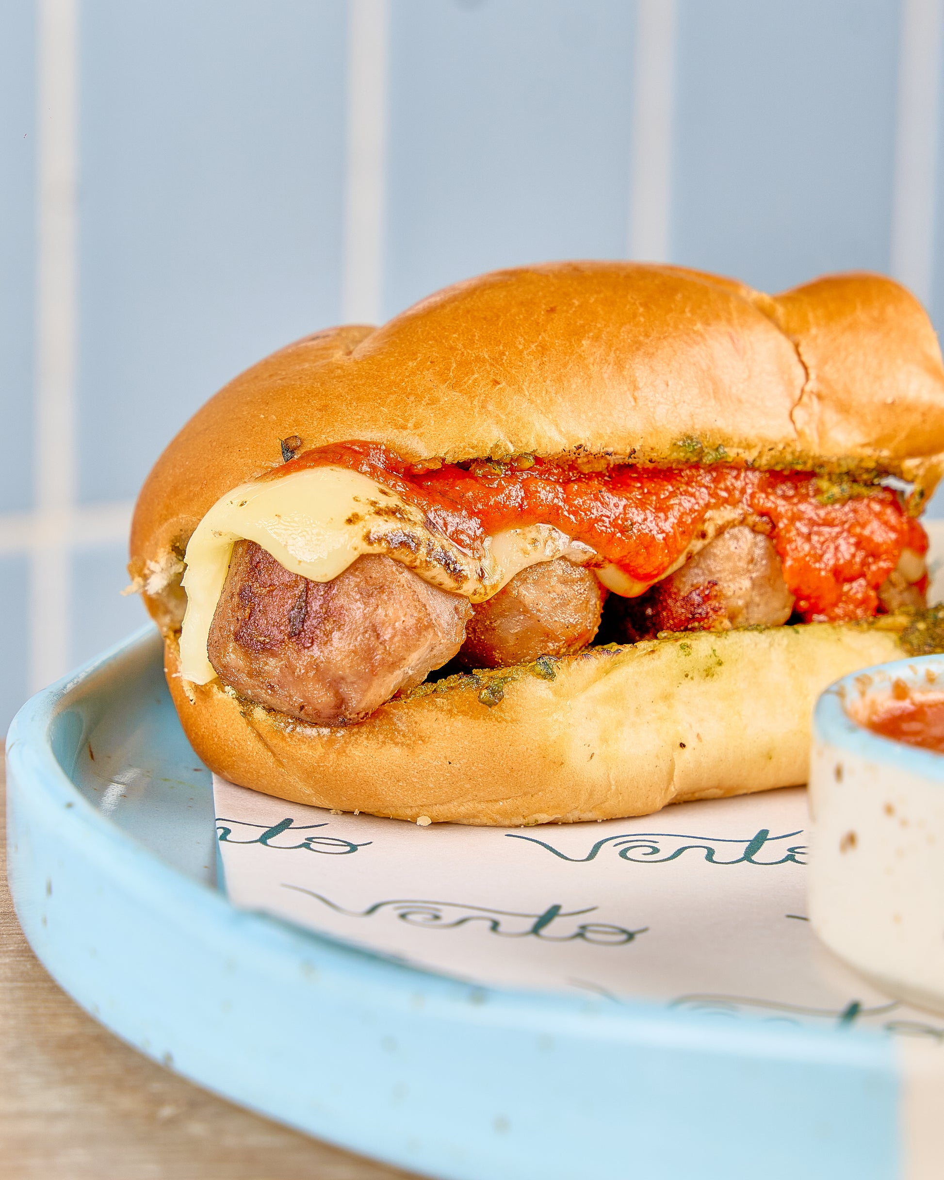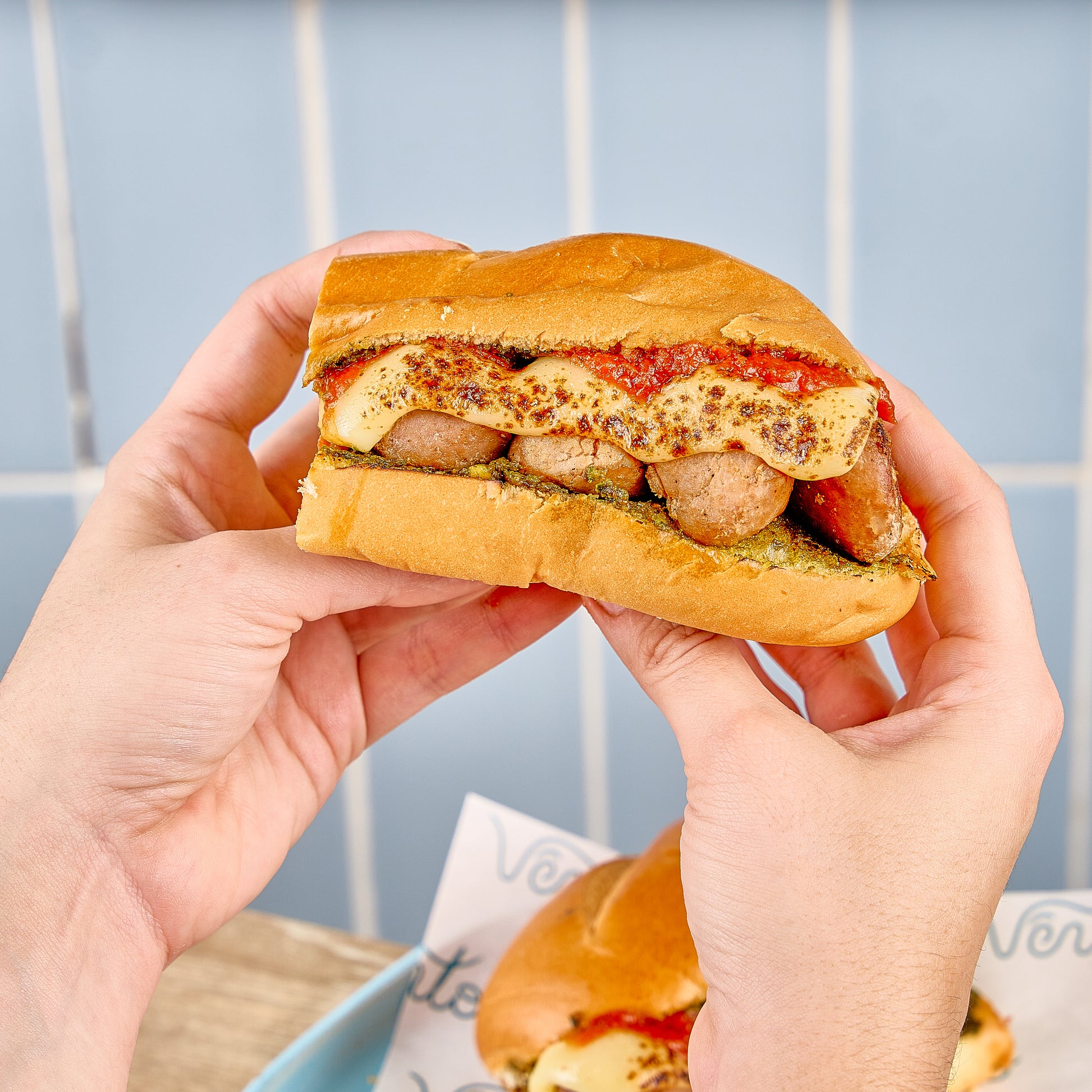 Albóndigas de cerdo rellenas de queso, servidas con mozzarella, queso parmesano, pesto y salsa napolitana en pan ciabatta.