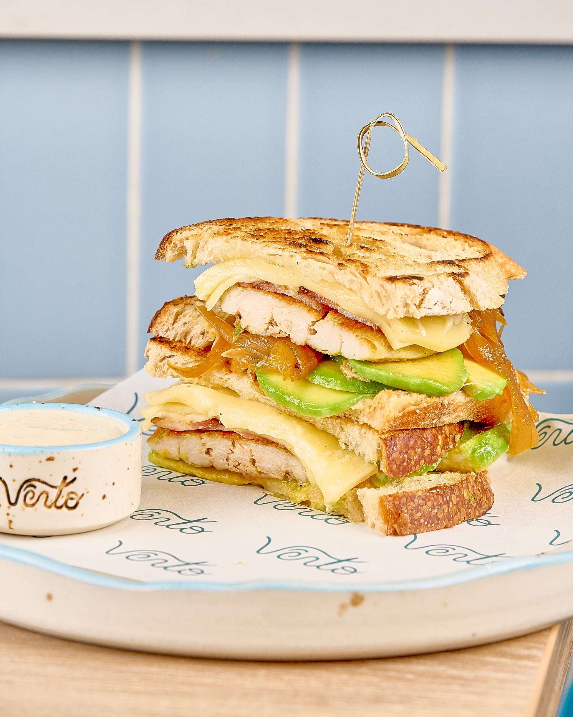 Tocinetas, cebolla caramelizada, queso mozzarella, pollo y salsa de parmesano en pan de masa madre.