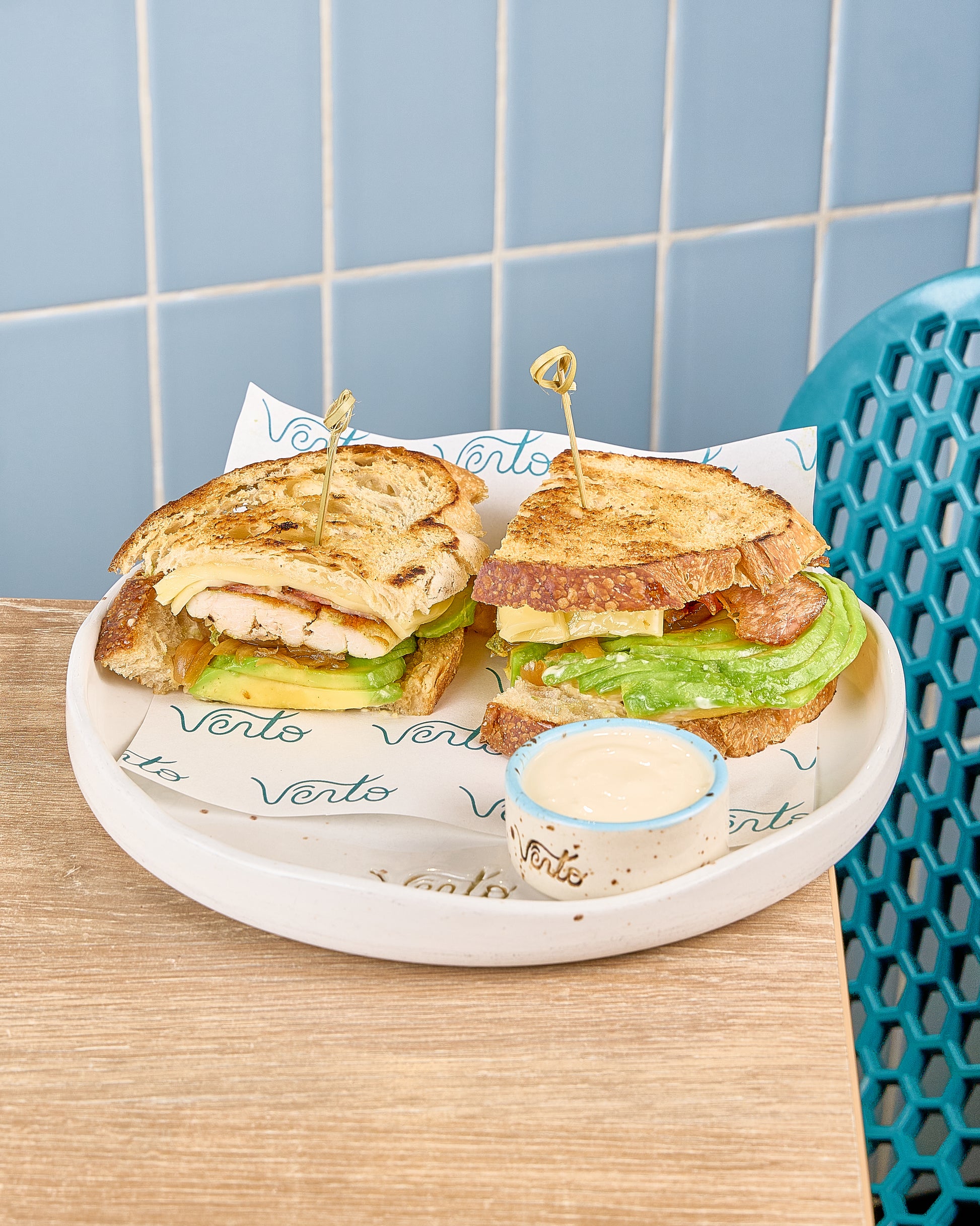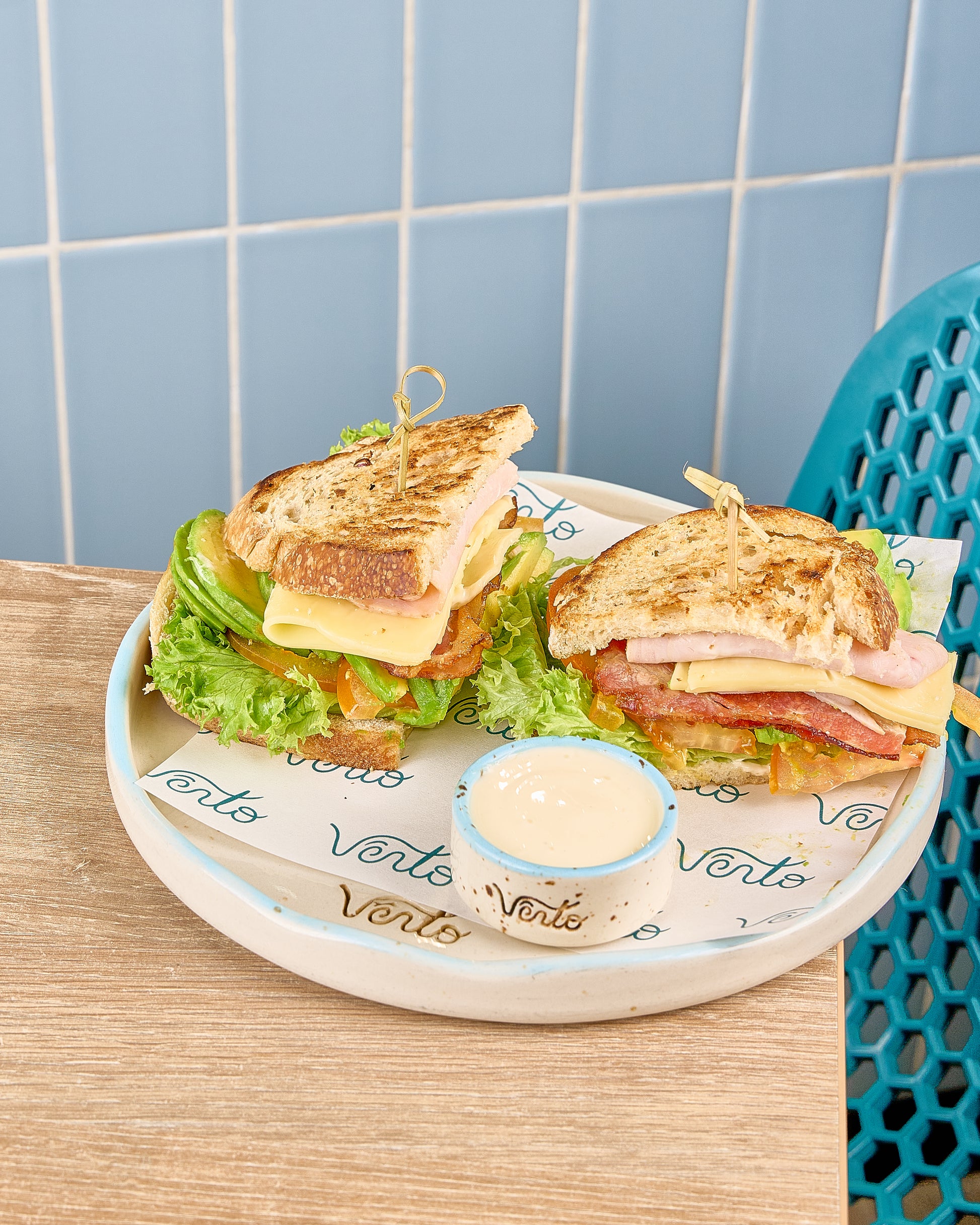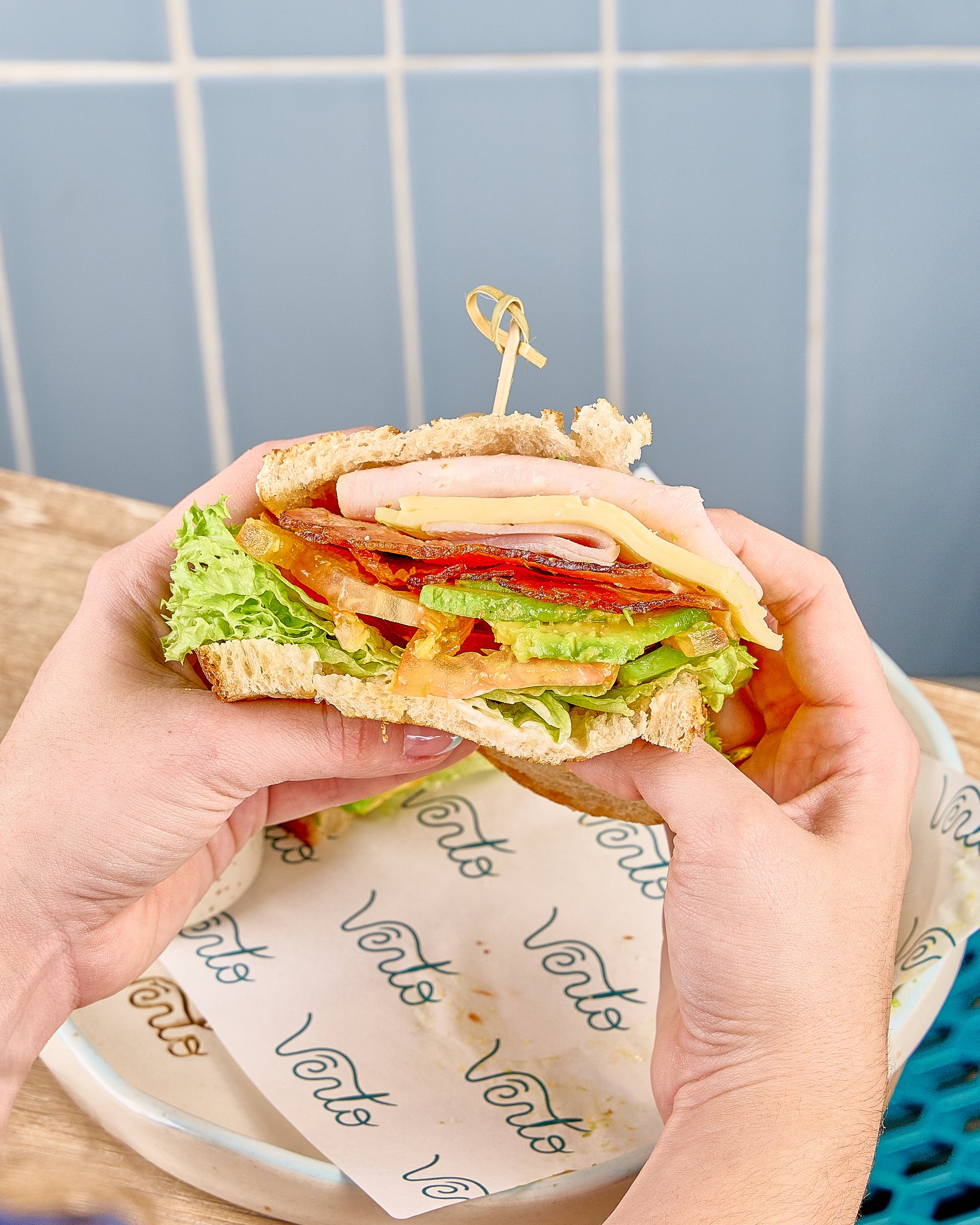 Jamón de pavo, tocineta, aguacate, tomate, lechuga, queso mozzarella y alioli en pan de masa madre tostado. Presentación renovada con palillo de bambú.