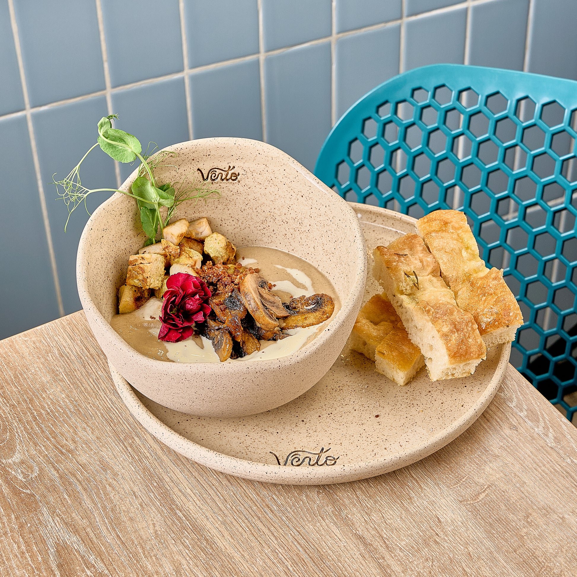 Crema intensa de champiñones con pollo, setas salteadas, crema de leche, polvo de chicharrón y pan focaccia.