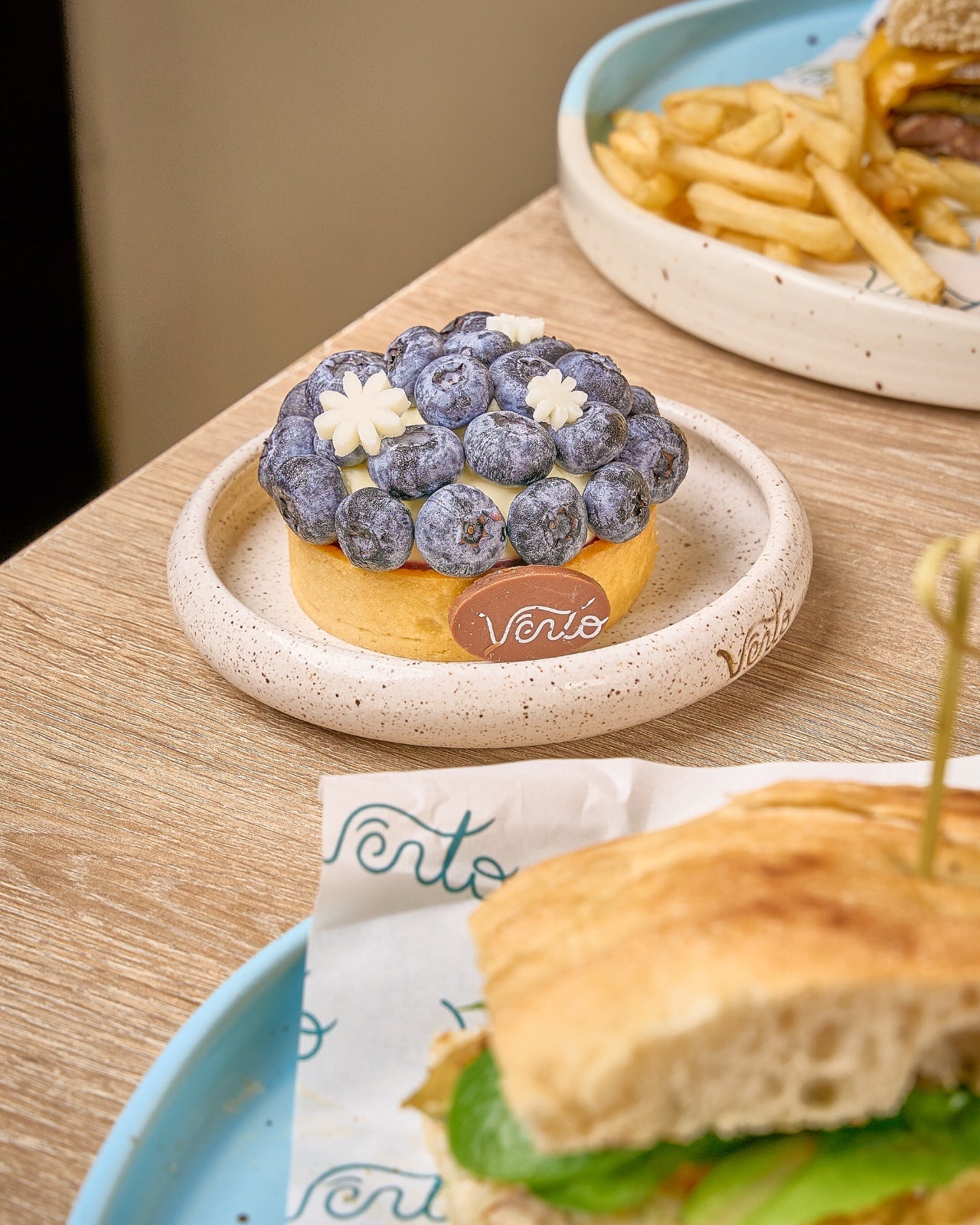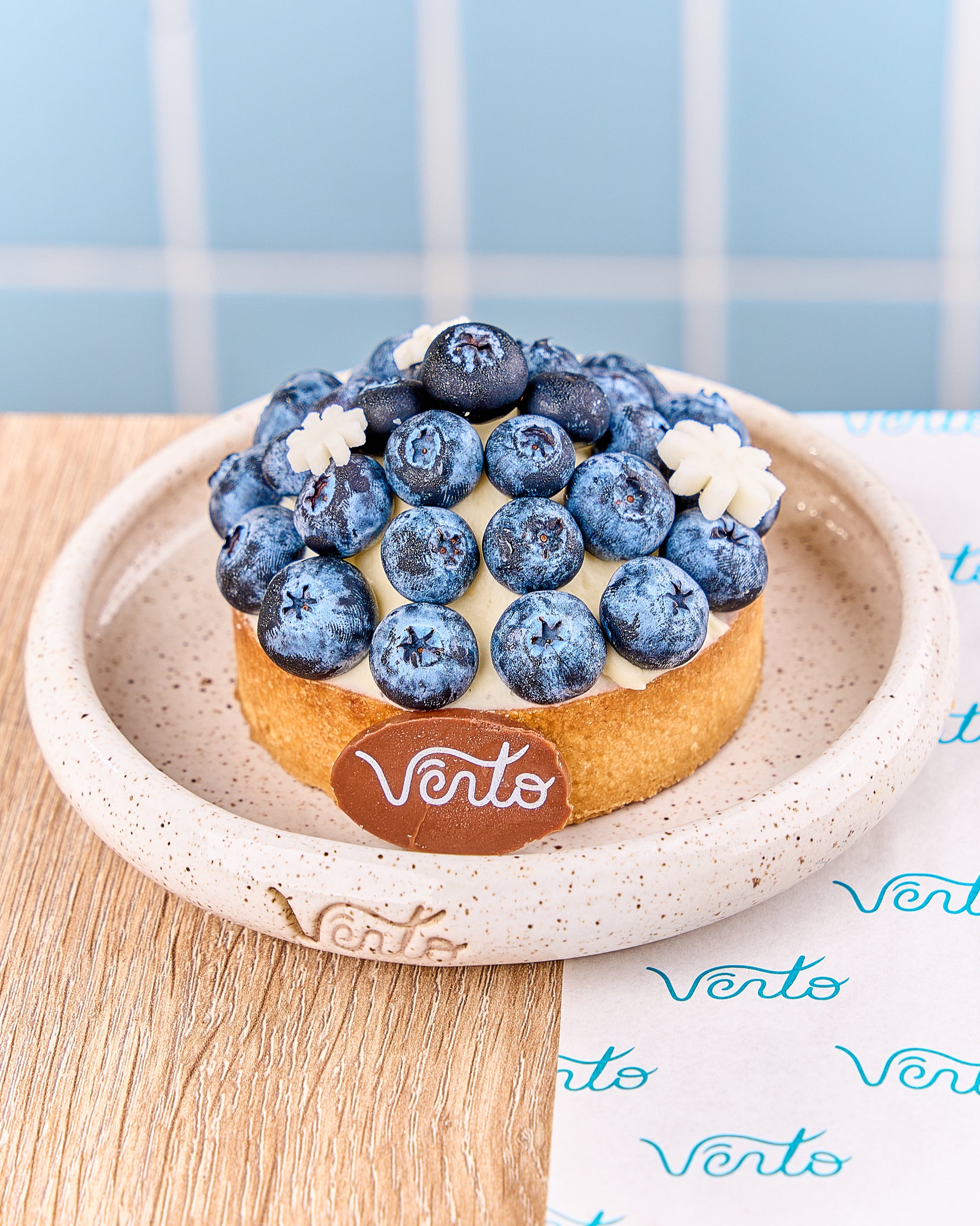 Fresca y delicada. Ganache de vainilla con arándanos frescos, cremoso de queso y pâte de fruit de arándanos sobre sable de vainilla.