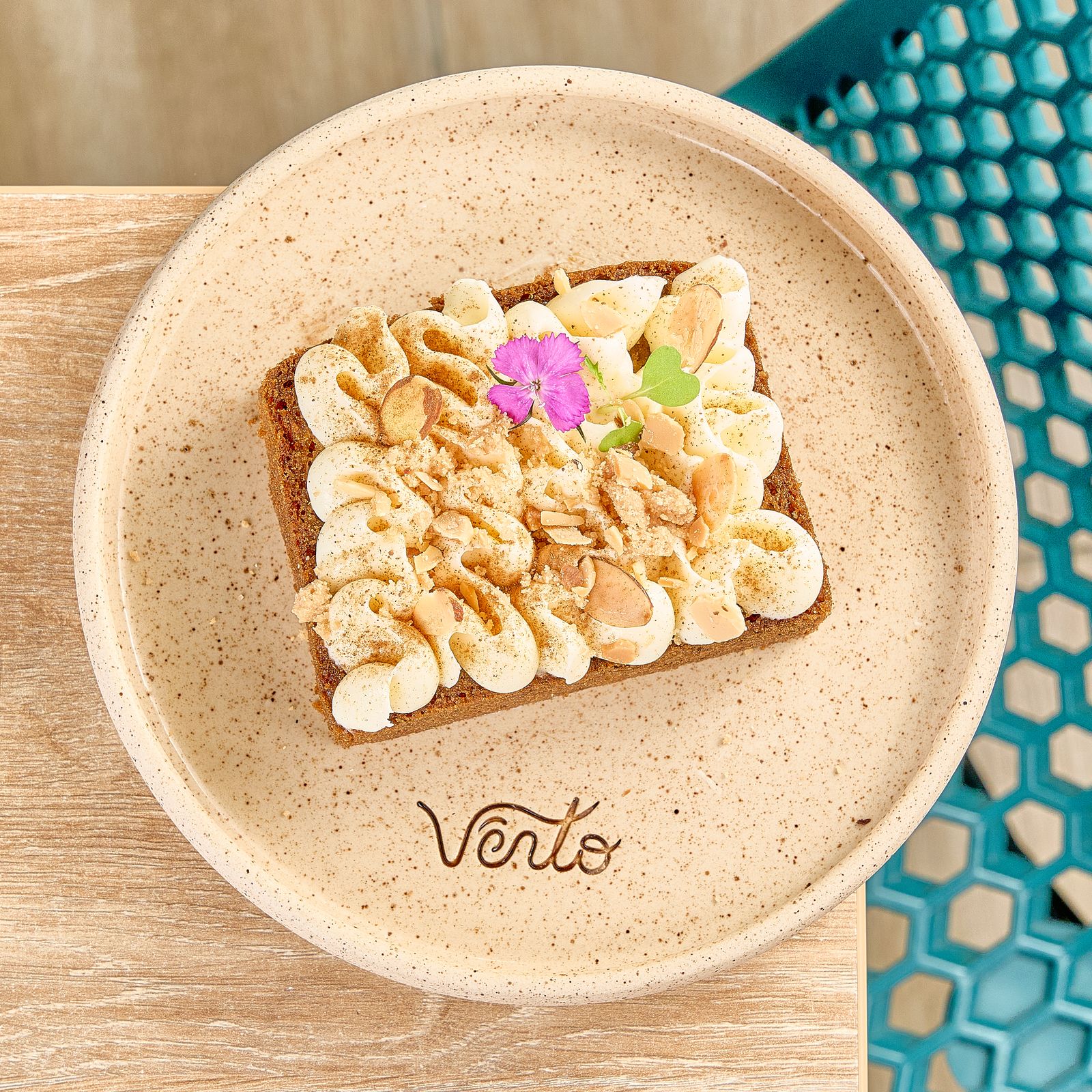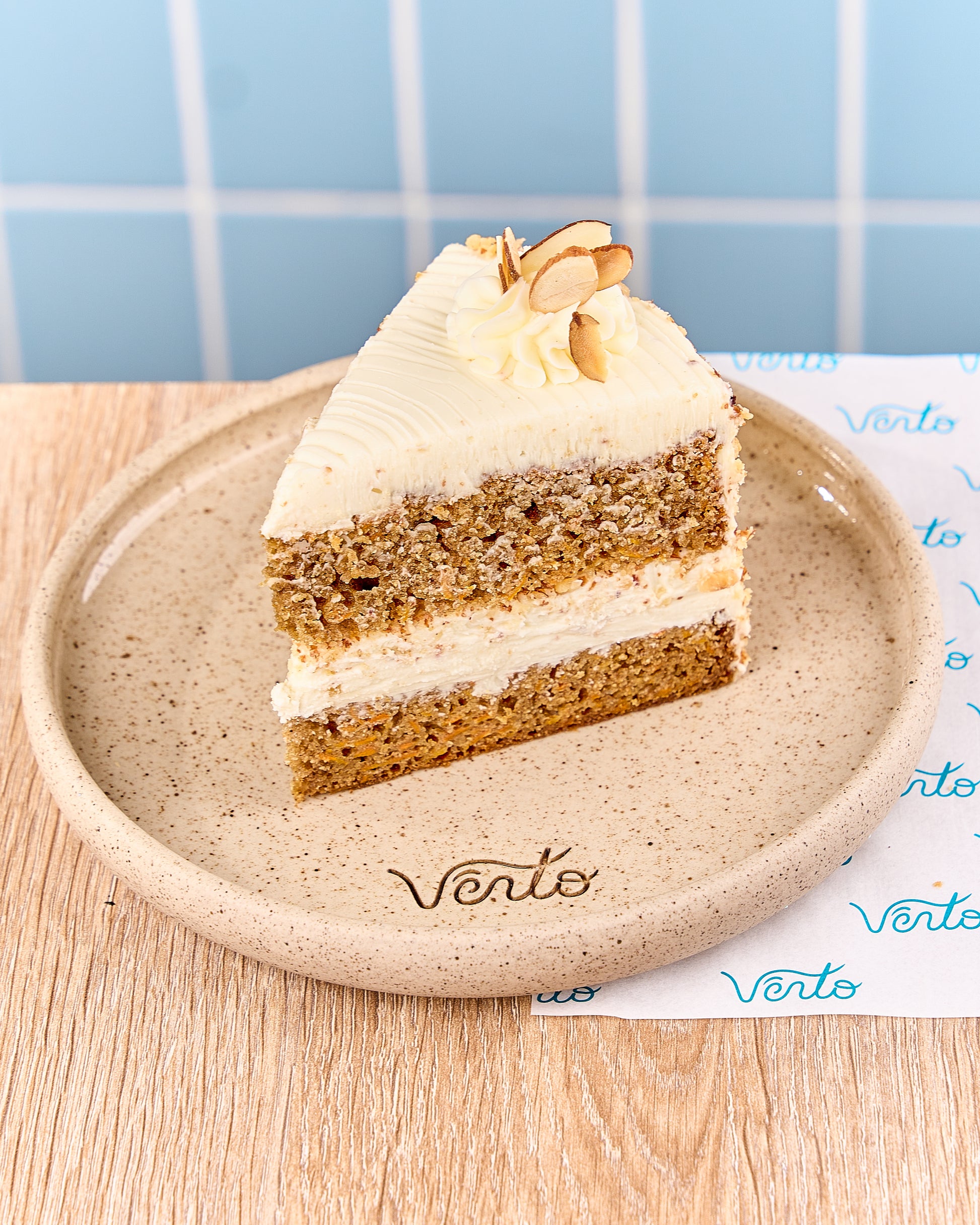 Clásica y especiada. Bizcocho de zanahoria con especias, queso crema y almendras fileteadas tostadas.