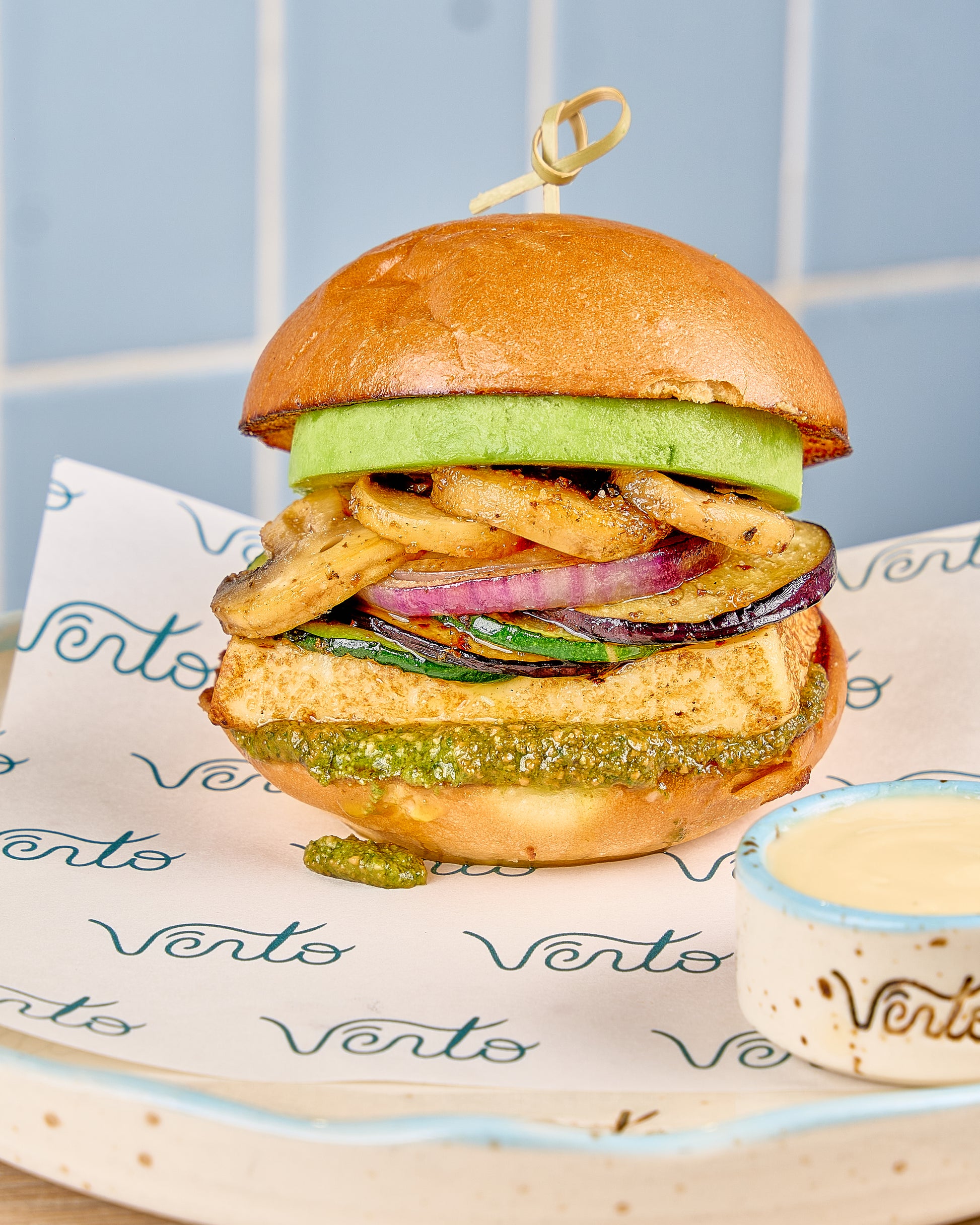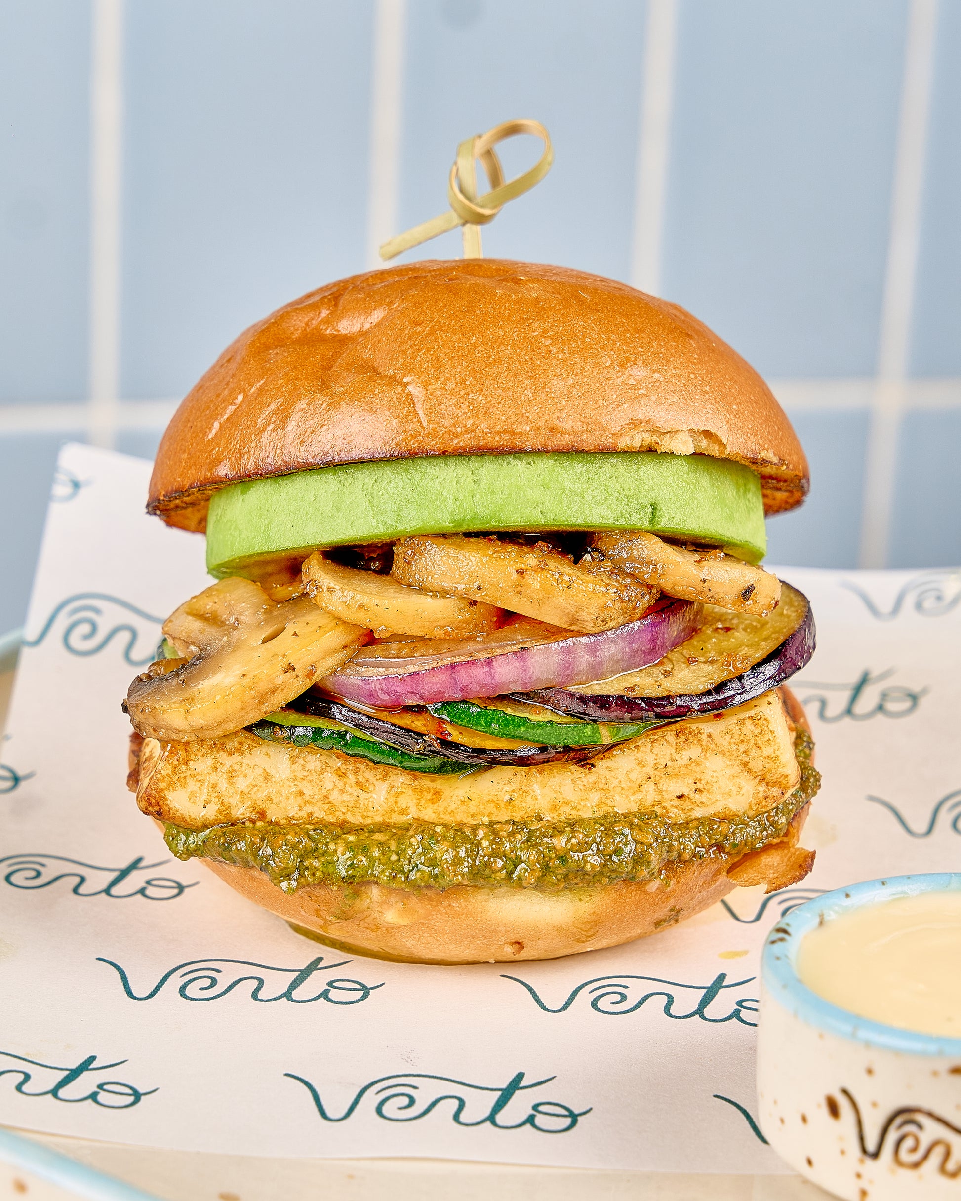 Berenjenas asadas, champiñones, tomates secos, lechuga, queso asado y pesto en pan ciabatta. Una opción vegetal llena de sabor.