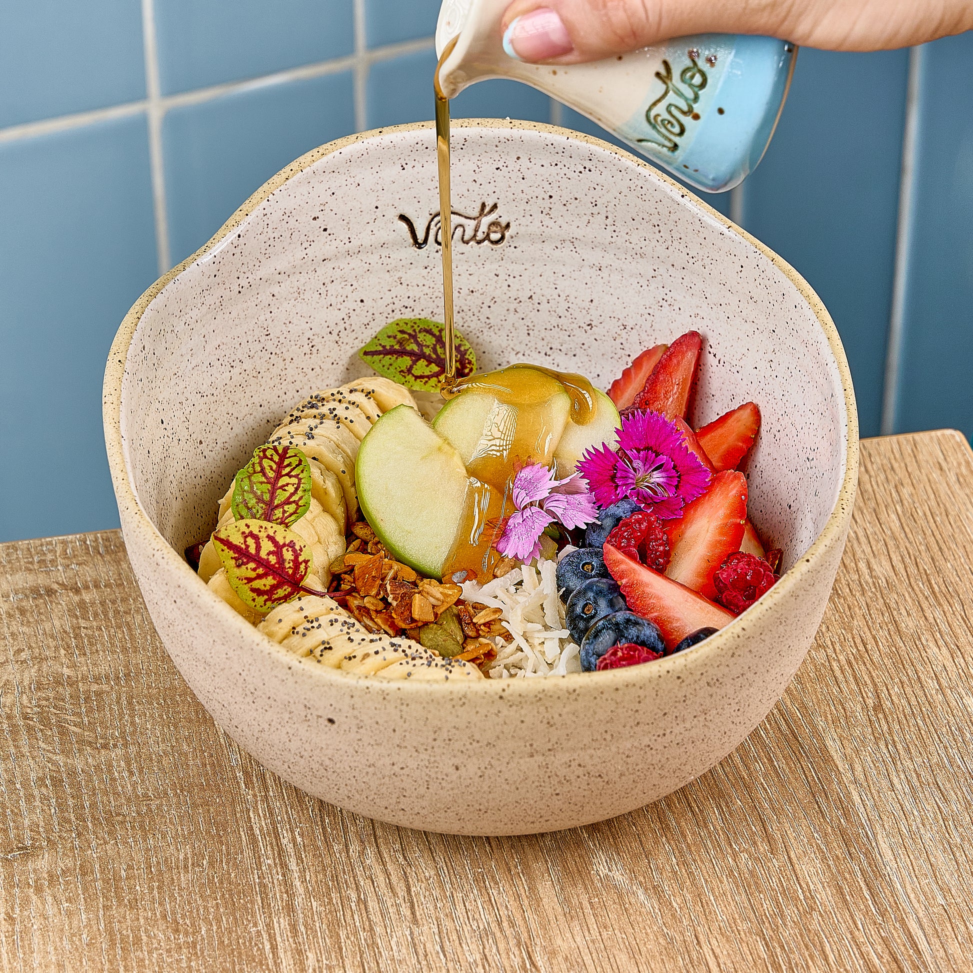Fruta de temporada servida con yogurt griego cremoso, granola artesanal, nueces, semillas y sirope de miel. Un desayuno o snack nutritivo, delicioso y lleno de texturas.